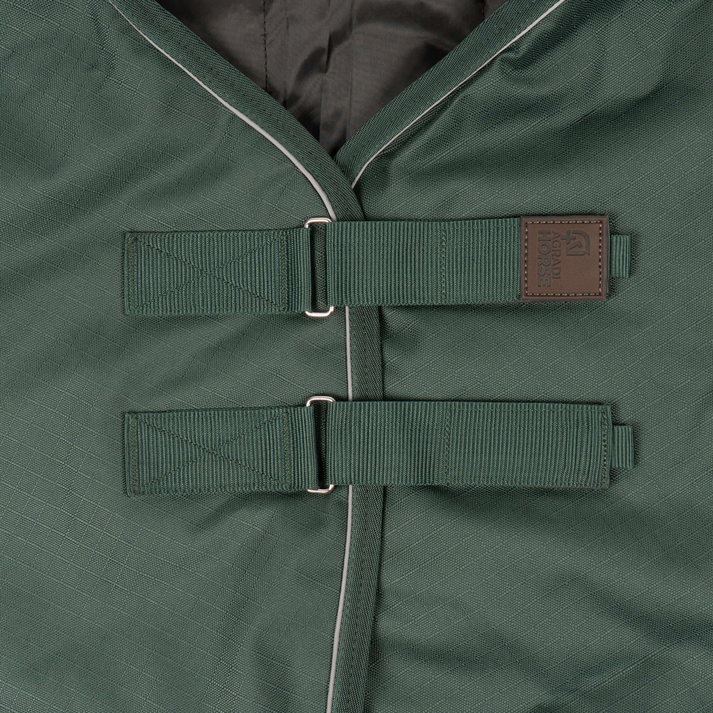 El cuello Agradi Horse 1200D 200gr con ribete reflectante verde es el complemento ideal para la manta de exterior Agradi Horse. Este cuello proporciona protección adicional contra el viento y la lluvia, manteniendo a tu caballo cálido y cómodo incluso con mal tiempo.