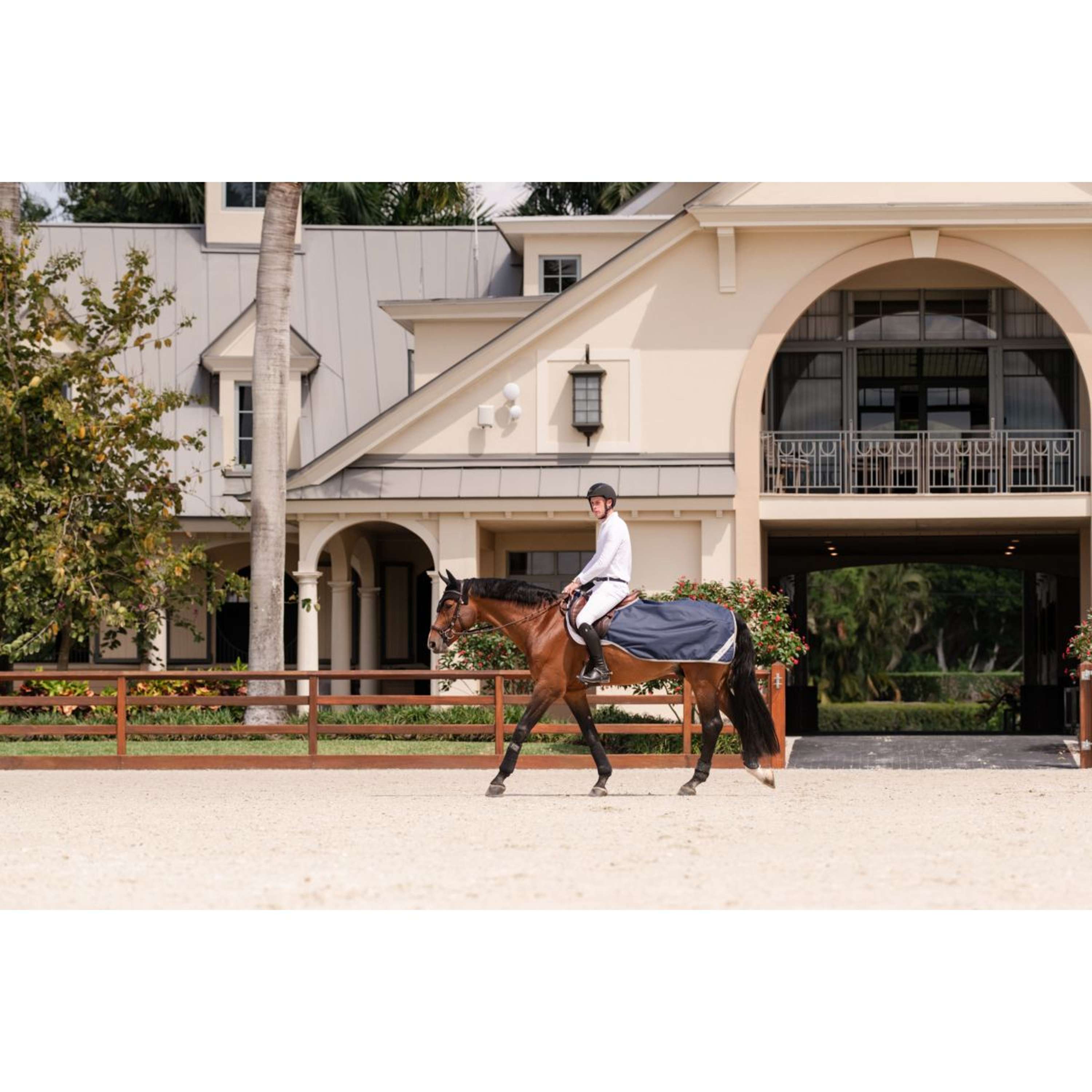 El diseño transpirable y resistente a la intemperie incluye una cuerda de filete para un ajuste seguro y tiras reflectantes audaces para mayor visibilidad. Terminada con un elegante ribete, esta sábana mantiene la espalda y los cuartos de tu caballo protegidos, llueva o truene.