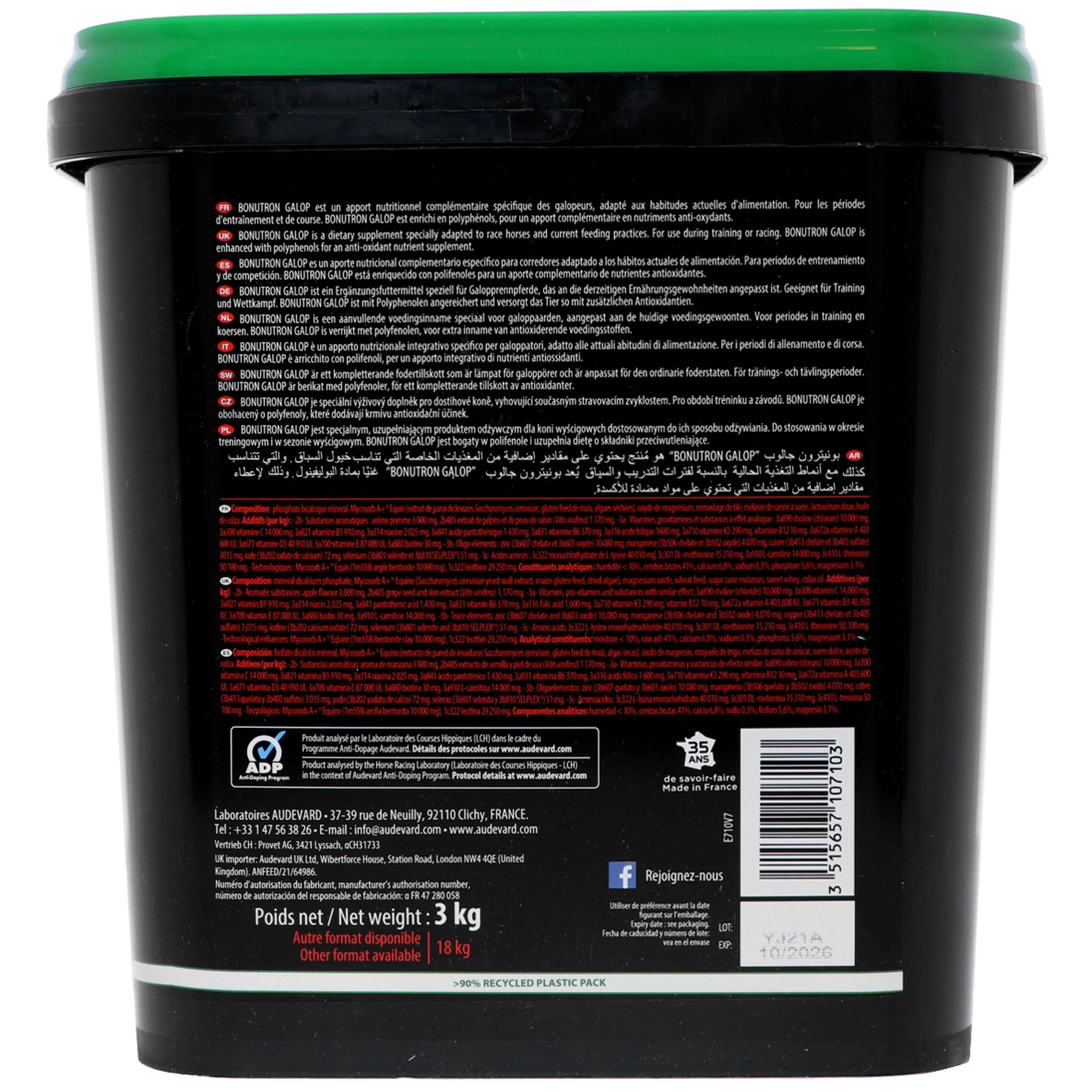 Una fórmula diseñada específicamente para caballos de carreras. Especialmente desarrollada para raciones a base de heno naturalmente rico en calcio (heno 'Foin de Crau', alfalfa, etc.). Diseñada para añadirse a todo tipo de raciones para caballos de carreras (heno + avena o concentrados procesados). Objetivo: Rendimiento muscular. Sistema muscular: Lisina y treonina. Gasto energético: L-carnitina. Antioxidantes: Fórmula enriquecida con polifenoles. Microprotección de la ración. Contiene Mycosorb A+® para caballos.