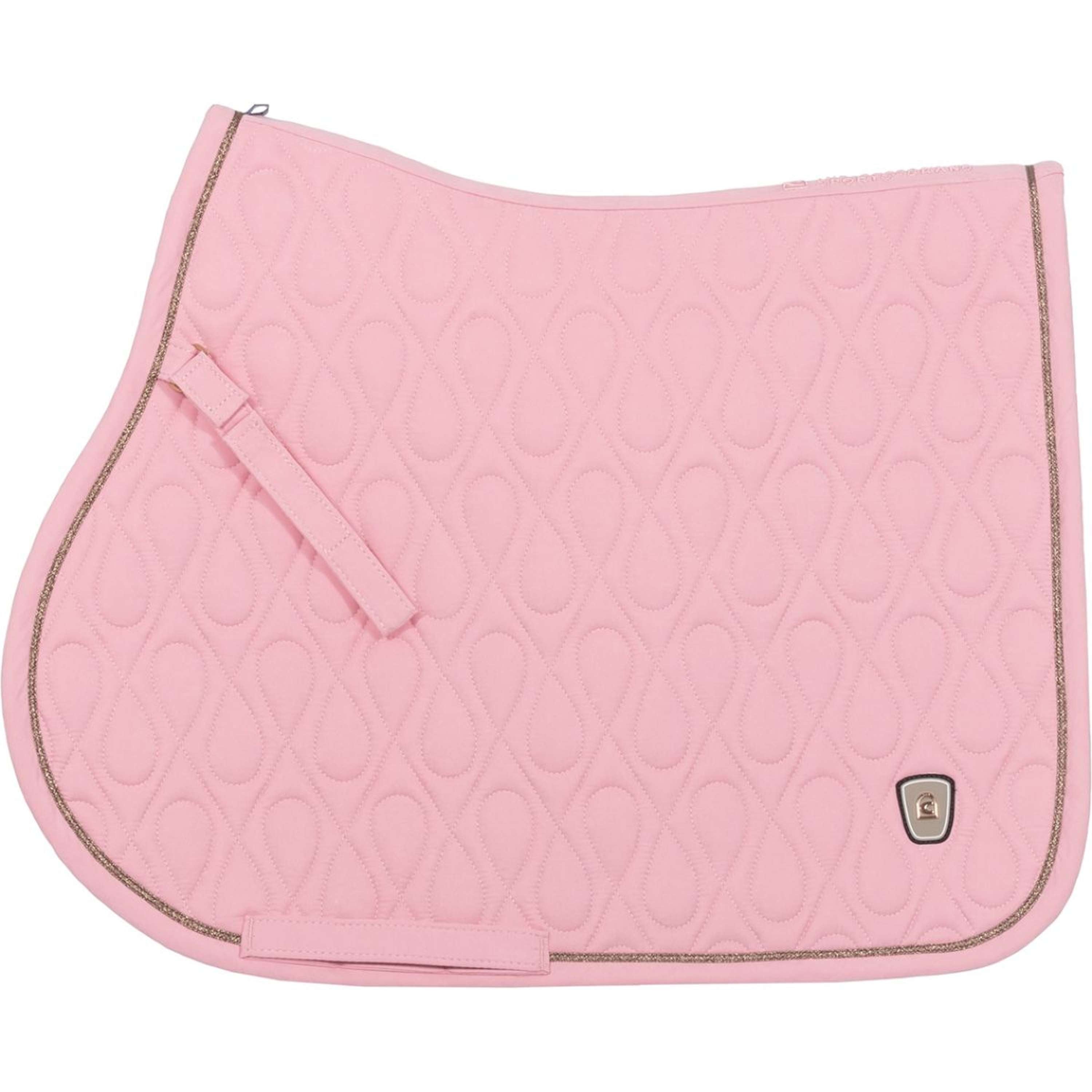 Almohadilla con elaborado patrón de acolchado y una superficie terciopelada, tipo melocotón. Aspecto femenino con cinta lurex y detalles dorados. Los nuevos parches con el logo de Cavallo en las esquinas traseras llaman mucho la atención. Otro detalle es el bordado en el canal trasero. El forro de malla de secado rápido y que absorbe la humedad es especialmente amigable para la piel y ofrece el máximo confort. El acolchado que retiene la forma permite que la almohadilla de la silla repose perfectamente sobre el lomo del caballo. Las correas de la parte superior son desmontables. Las correas de cinturón inferior con tres lazos de cierre interiores aseguran una posición exacta del sillín.