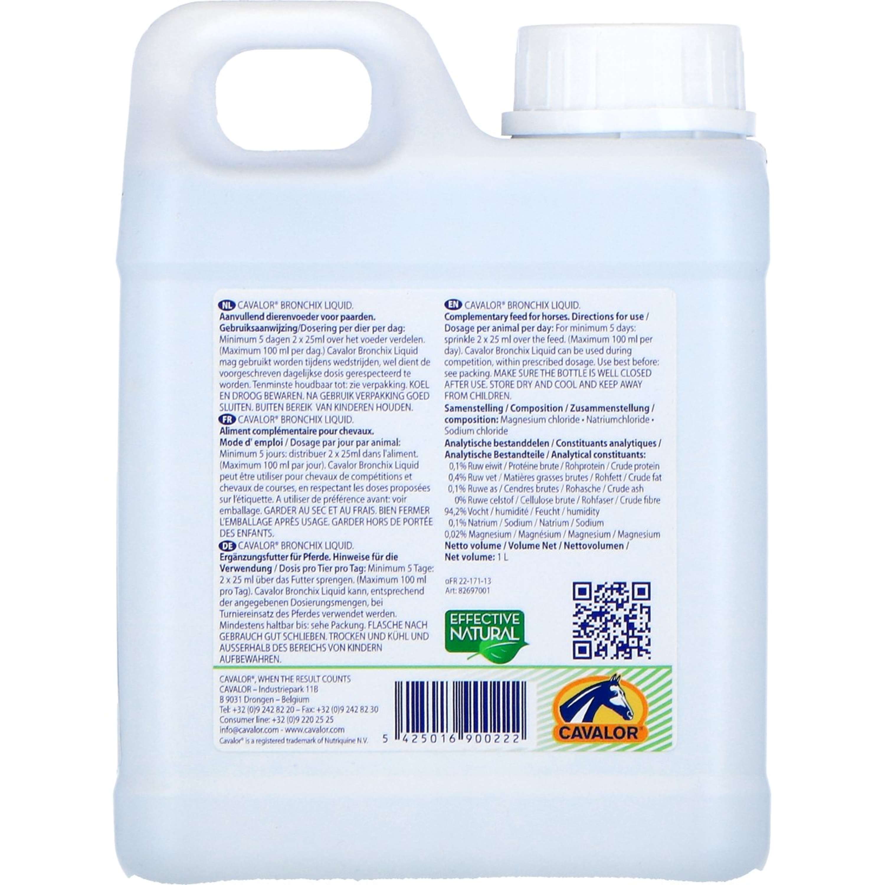 Cavalor Bronchix Liq incluye ingredientes cuidadosamente seleccionados para fortalecer el sistema respiratorio de tu caballo. Ideal para caballos expuestos al polvo, el polen o distintos cambios de clima que puedan afectar su salud respiratoria.