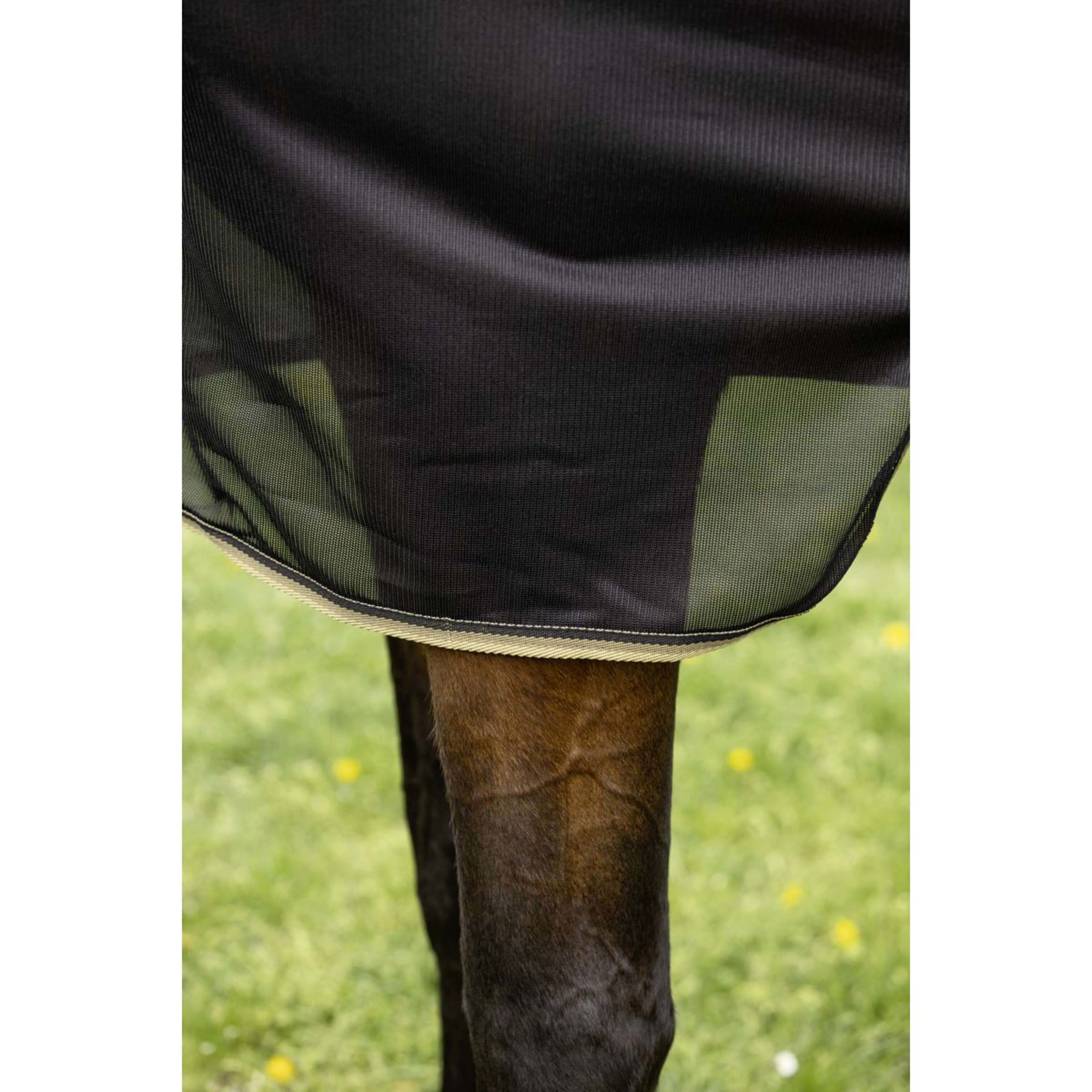 La manta antimoscas combina ligereza y durabilidad en un material especialmente cómodo, perfecto para usar en el pasto o el potrero. El poliéster suave de malla fina ofrece una protección perfecta contra moscas molestas, insectos que pican y pican. Las correas elásticas extraíbles para las piernas evitan que la manta se deslice, mientras que la sección del cuello, también extraíble, se fija fácilmente con cierres de velcro. Una amplia solapa para la cola proporciona protección adicional, y la zona del pecho está acolchada para mayor comodidad. Los cierres de velcro en el cuello y el pecho permiten un ajuste individual. Además, la manta es resistente a los rayos UV, por lo que su caballo estará bien protegido incluso en días soleados.