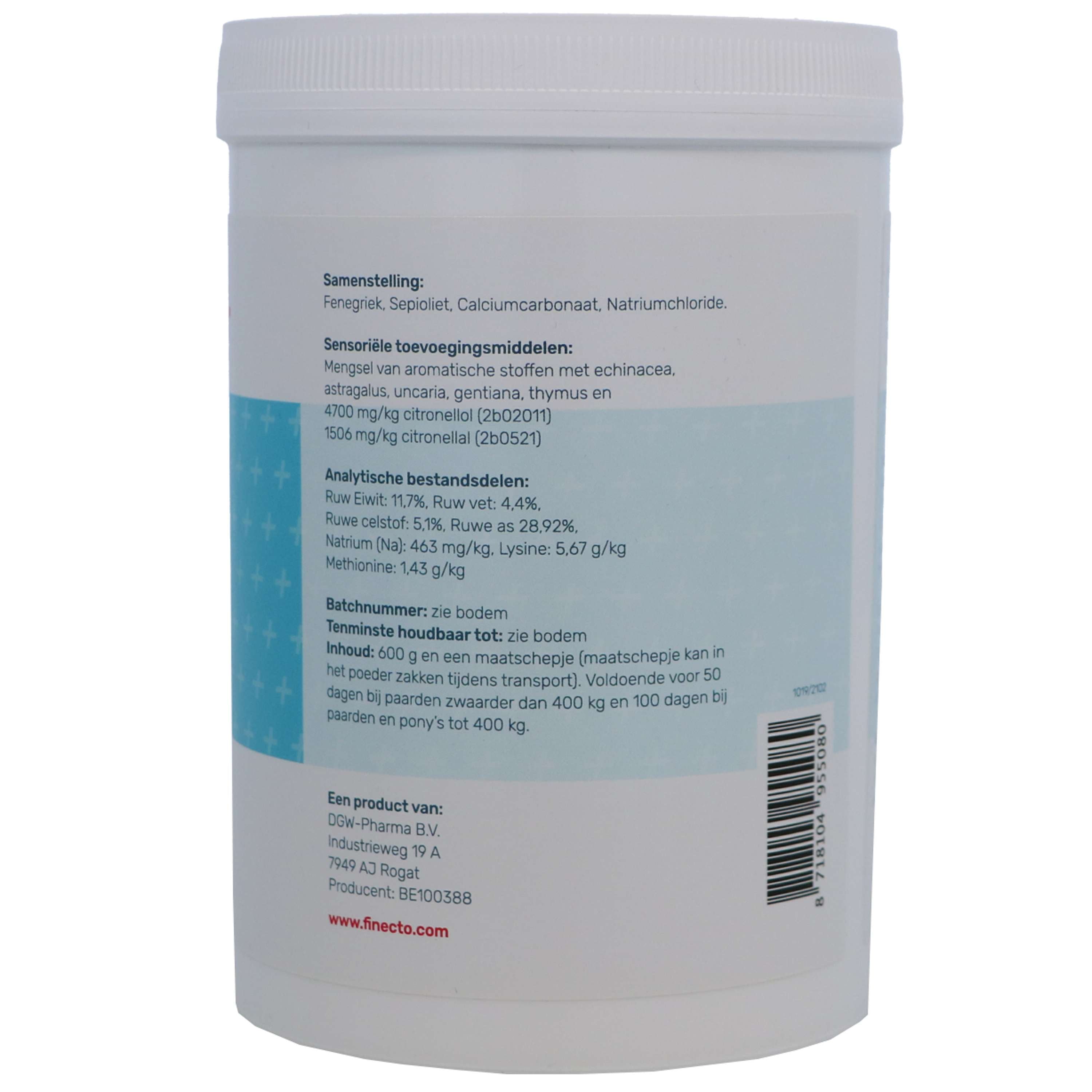 Finecto+ HORSE es un suplemento alimenticio para caballos y ponis, a base de sustancias aromáticas cuidadosamente seleccionadas que se pueden espolvorear fácilmente sobre el alimento.