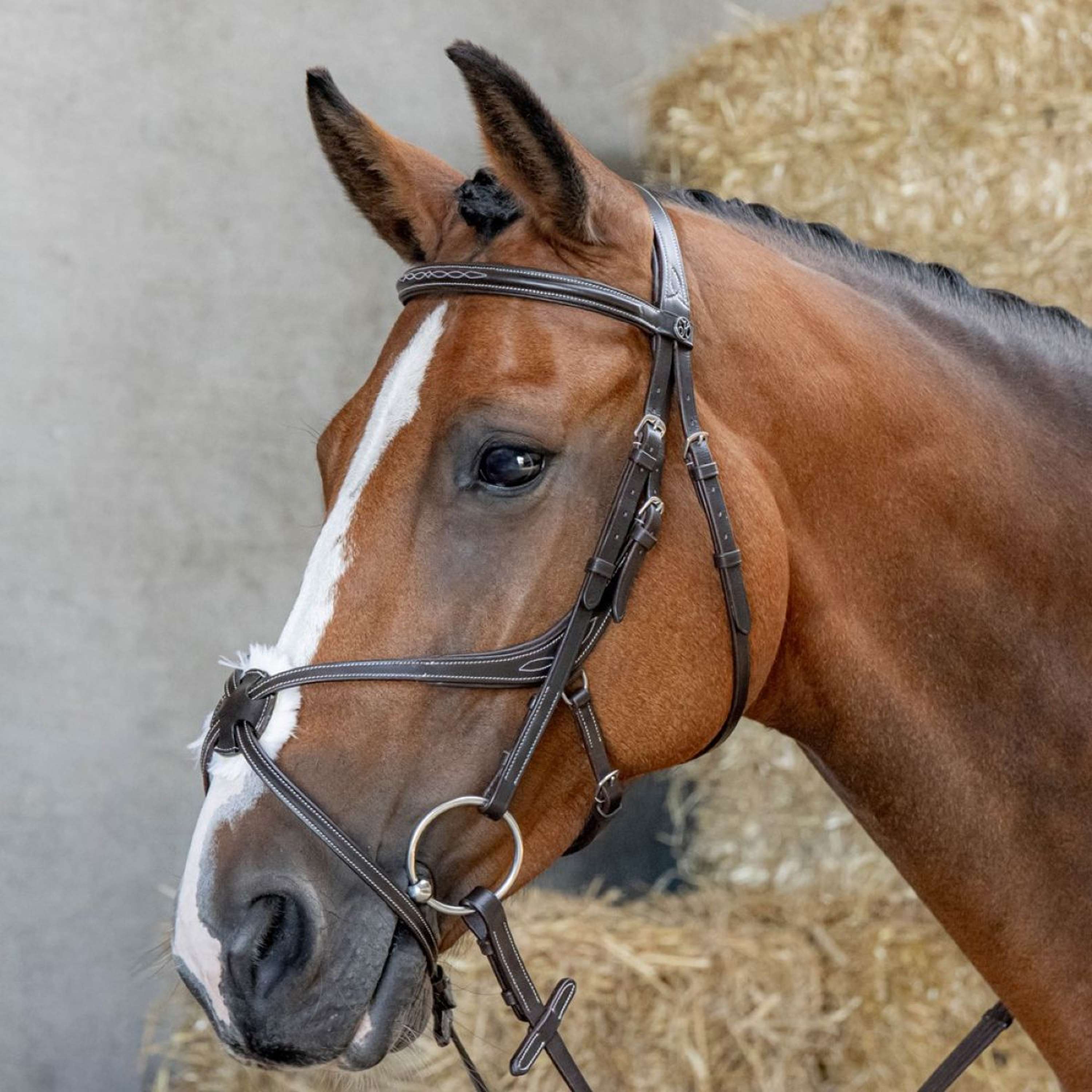 Cabezada de cuero con muserola mexicana anatómica y testera anatómica. Presenta acolchado suave y costuras en contraste en la testera, la frontalera y la muserola. Acolchado extra suave bajo el centro de la muserola. Incluye riendas de cincha.