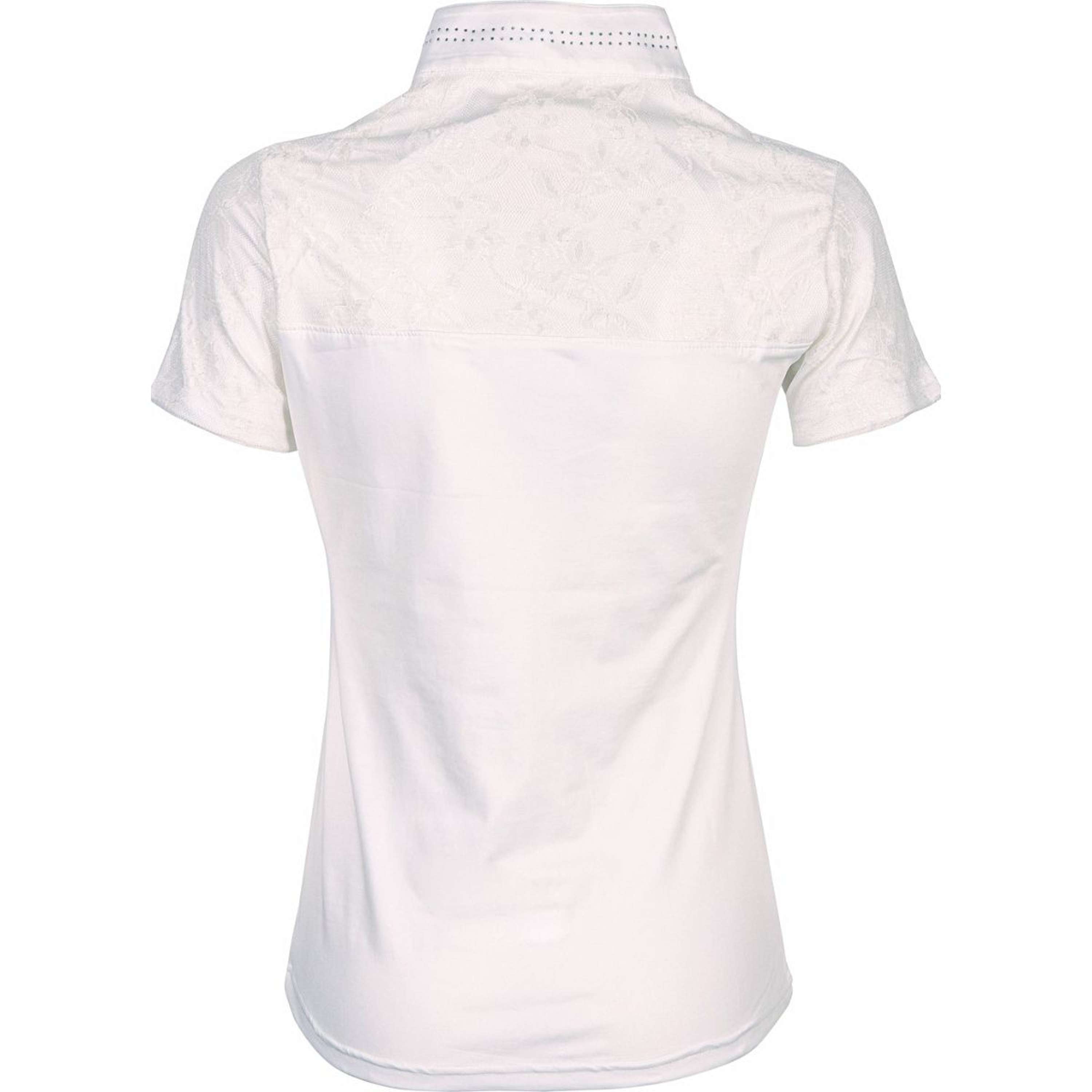 Camiseta de competición con cuello alto blanco con cremallera corta y cristales de colores alrededor, parcialmente cubierta con encaje tono sobre tono en la parte delantera y trasera. 93% Micropoliéster 7% Elastano