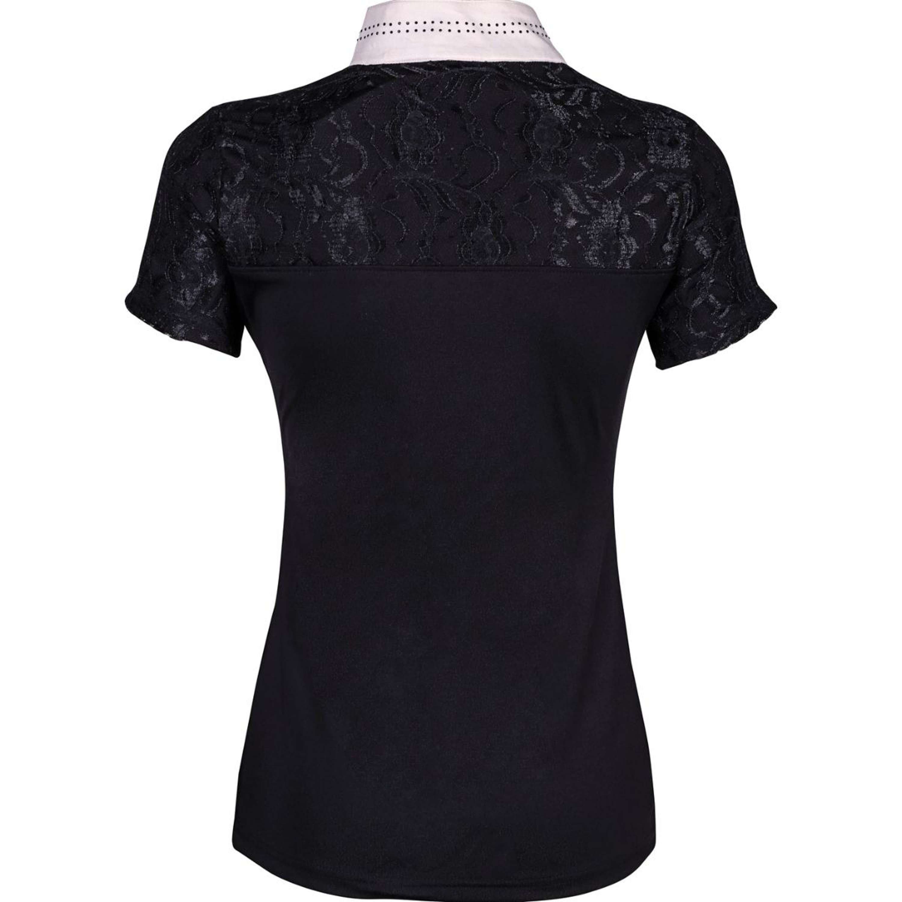 Camiseta de competición con cuello alto blanco con cremallera corta y cristales de colores alrededor, parcialmente cubierta con encaje tono sobre tono en la parte delantera y trasera. 93% Micropoliéster 7% Elastano