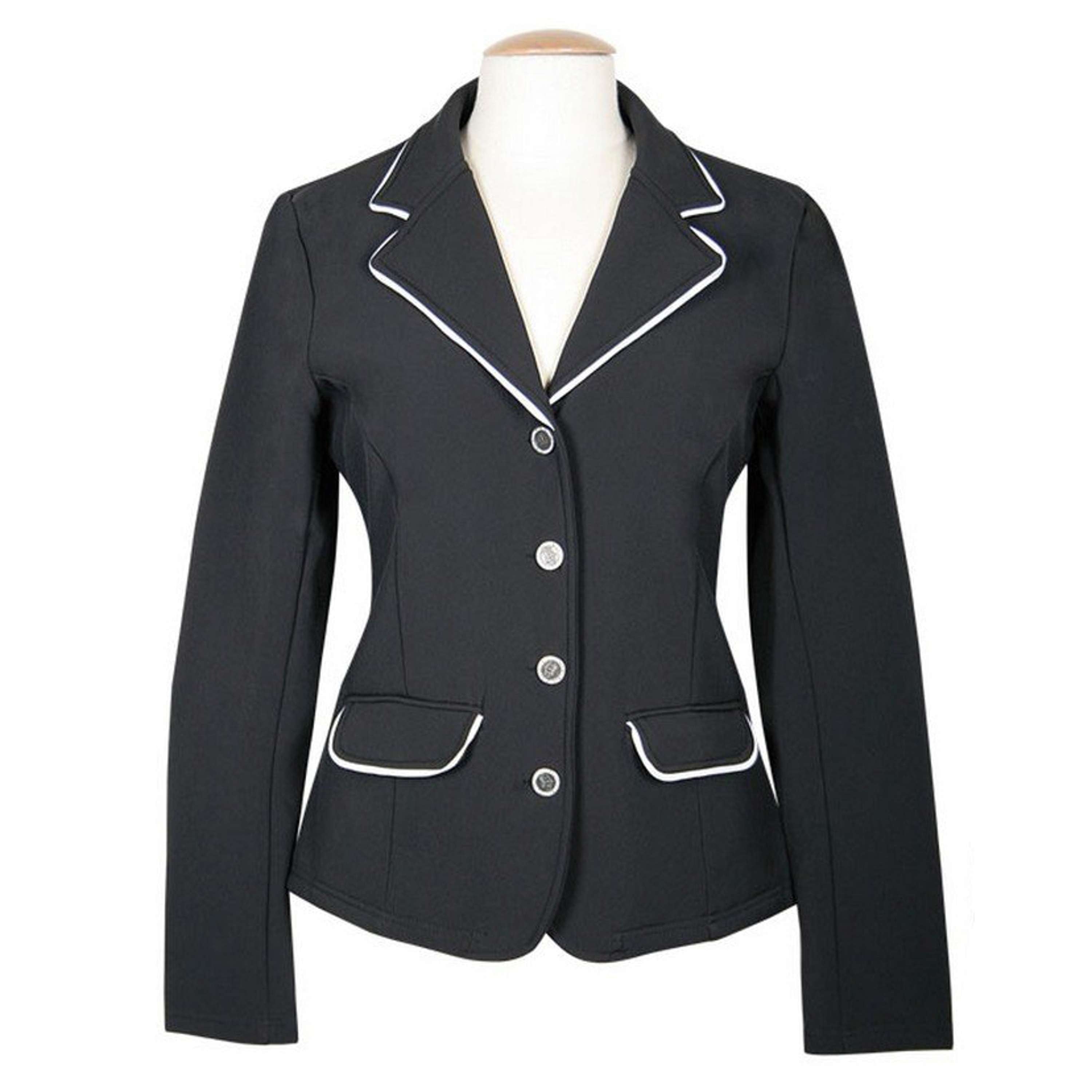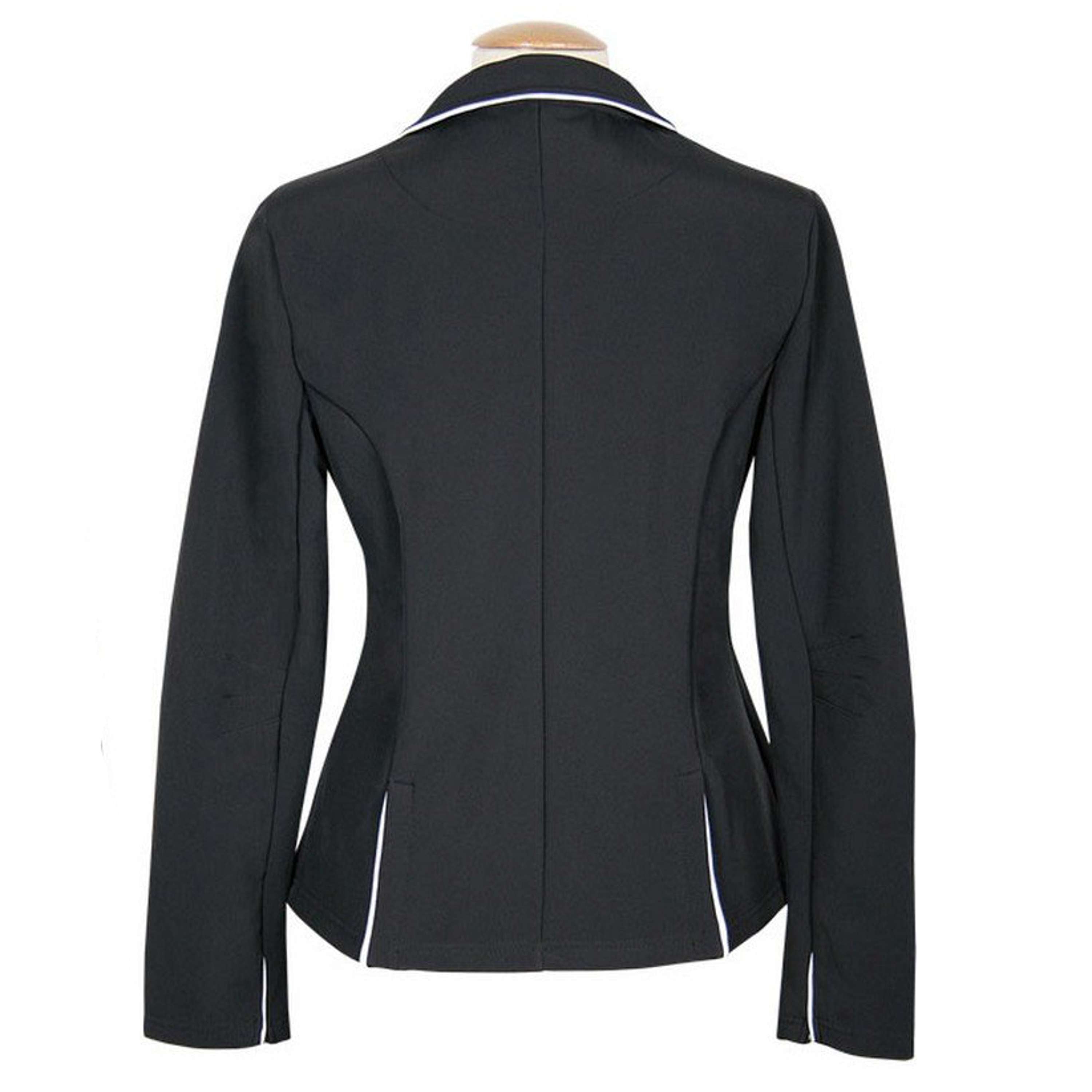 Chaqueta deportiva de equitación confeccionada en softshell de alta calidad, transpirable e impermeable. Diseño ajustado con tapeta de cuatro botones, ribete de color en el cuello y dos aberturas en la espalda. Material: 100 % poliéster softshell.