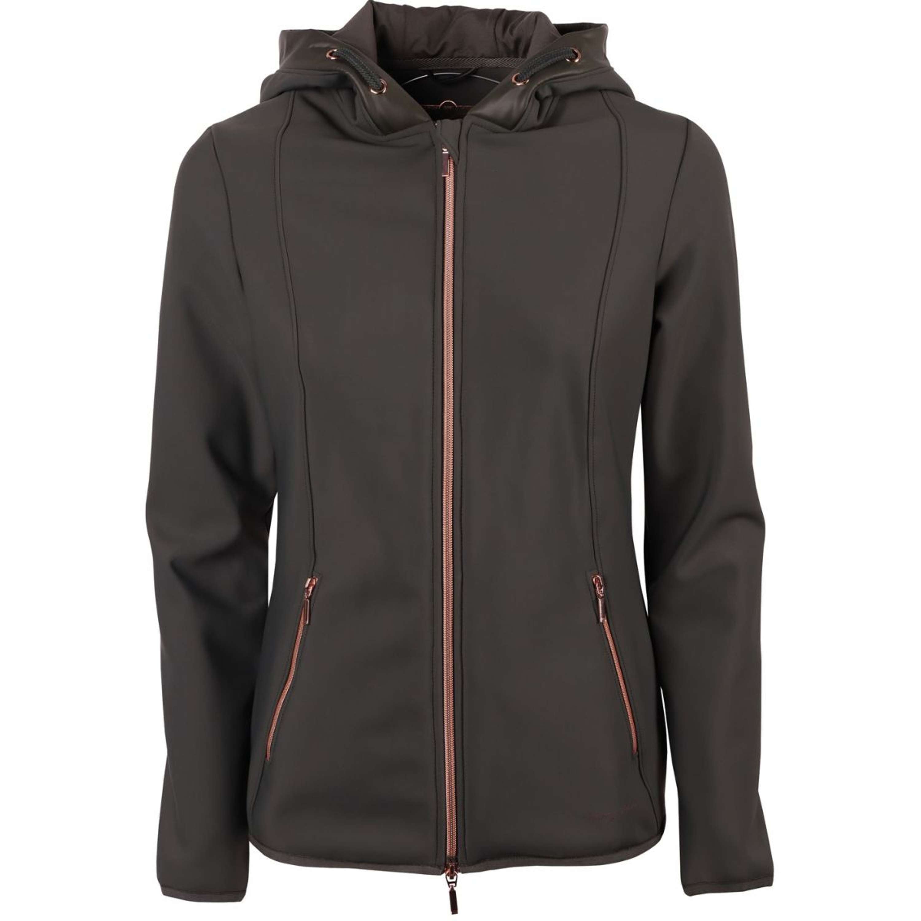 Chaqueta softshell con capucha. La capucha se cierra con un broche a presión en la espalda, tiene una cremallera bidireccional en tono oro rosa y dos bolsillos con cremallera. Material: 74 % nailon/26 % elastano, forro: 92 % poliéster/8 % elastano.