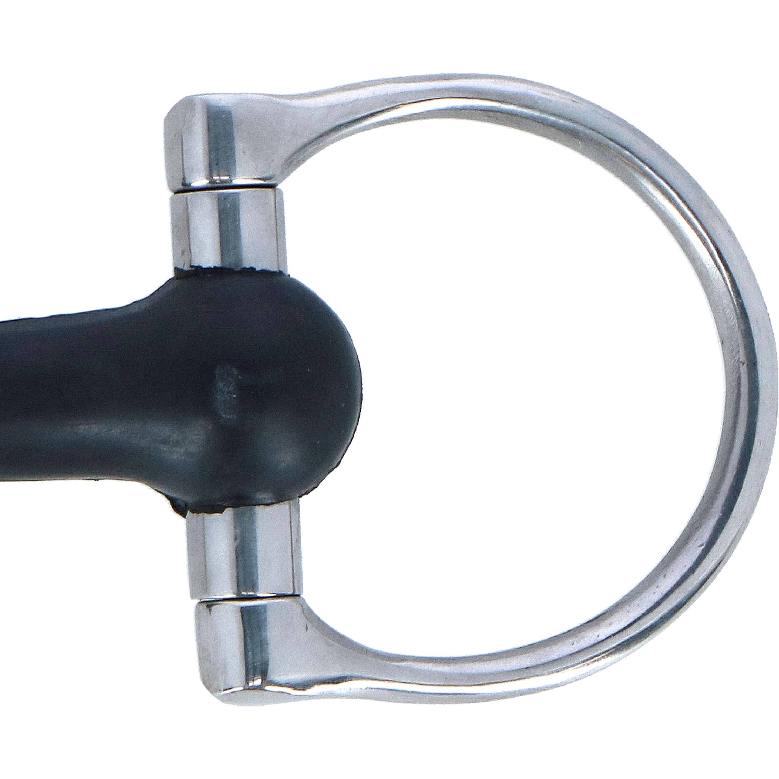 Bocado en forma de D fabricado en acero inoxidable de alta calidad con embocadura de goma. Gracias a su forma en D, el bocado se mantiene firme y silencioso en la boca, guiando al caballo ligeramente mediante la presión en las mejillas. Grosor: 20 mm. Anilla: 65 mm.