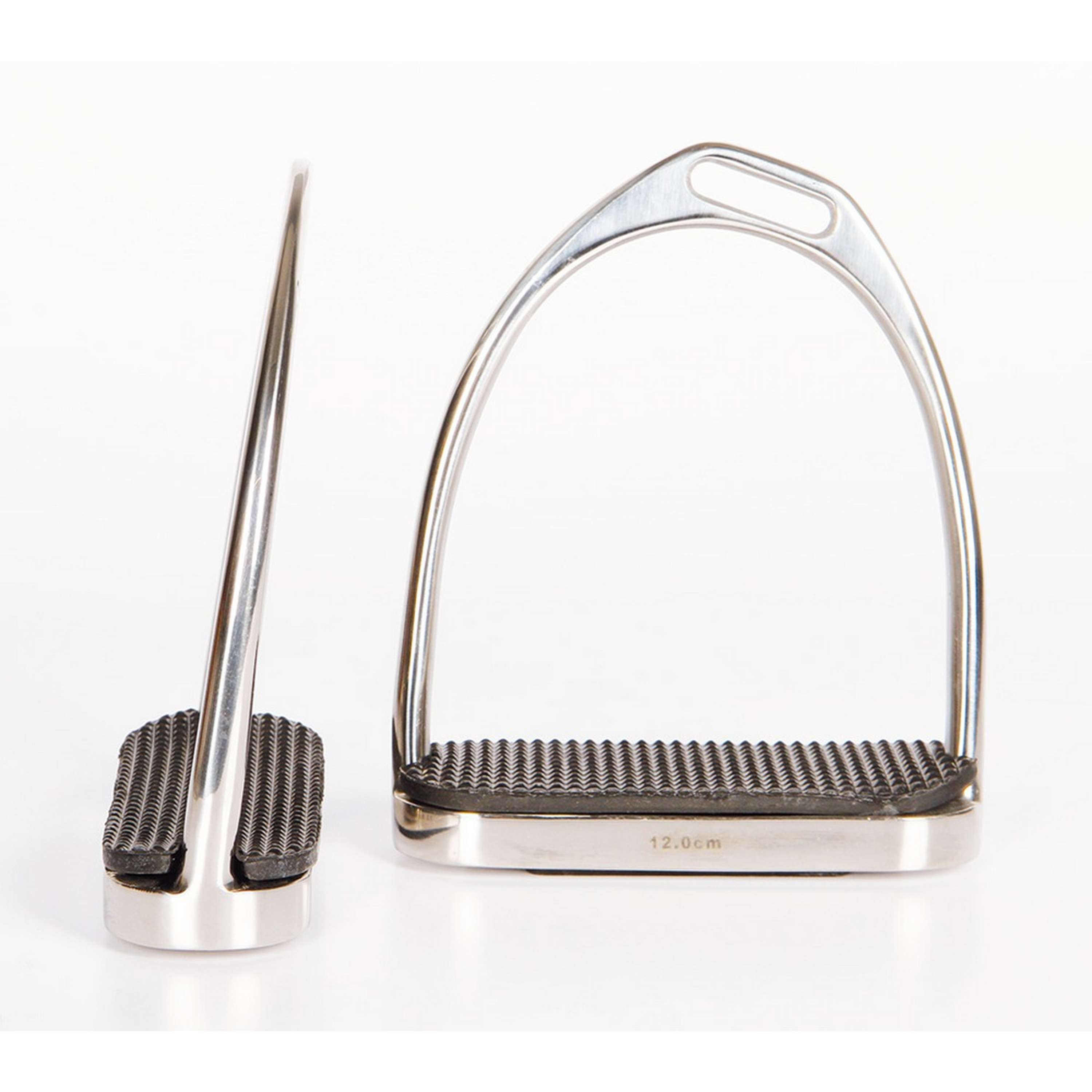 Fabricado en acero inoxidable de alta calidad. Ofrece comodidad y estabilidad tanto para el caballo como para el jinete. Incluye suelas elásticas. El diseño doble asimétrico desplaza automáticamente el talón hacia abajo y hacia adentro para una mejor posición de la pierna.