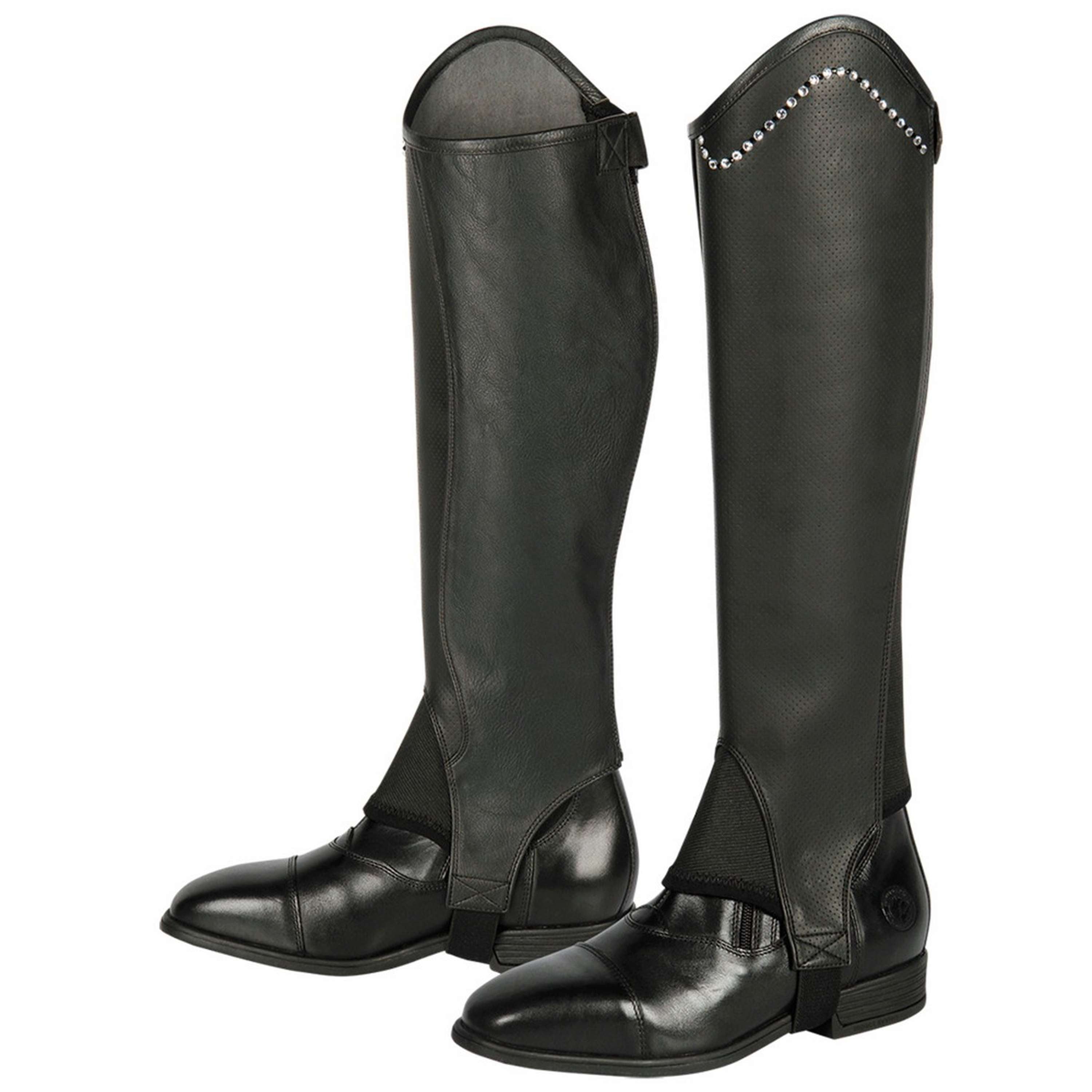 Lujosas mini polainas flexibles con sección elástica en la pantorrilla y cremallera exterior. Fabricadas con materiales sintéticos de alta calidad. Una hilera de cristales de lujo a lo largo del arco de doma.