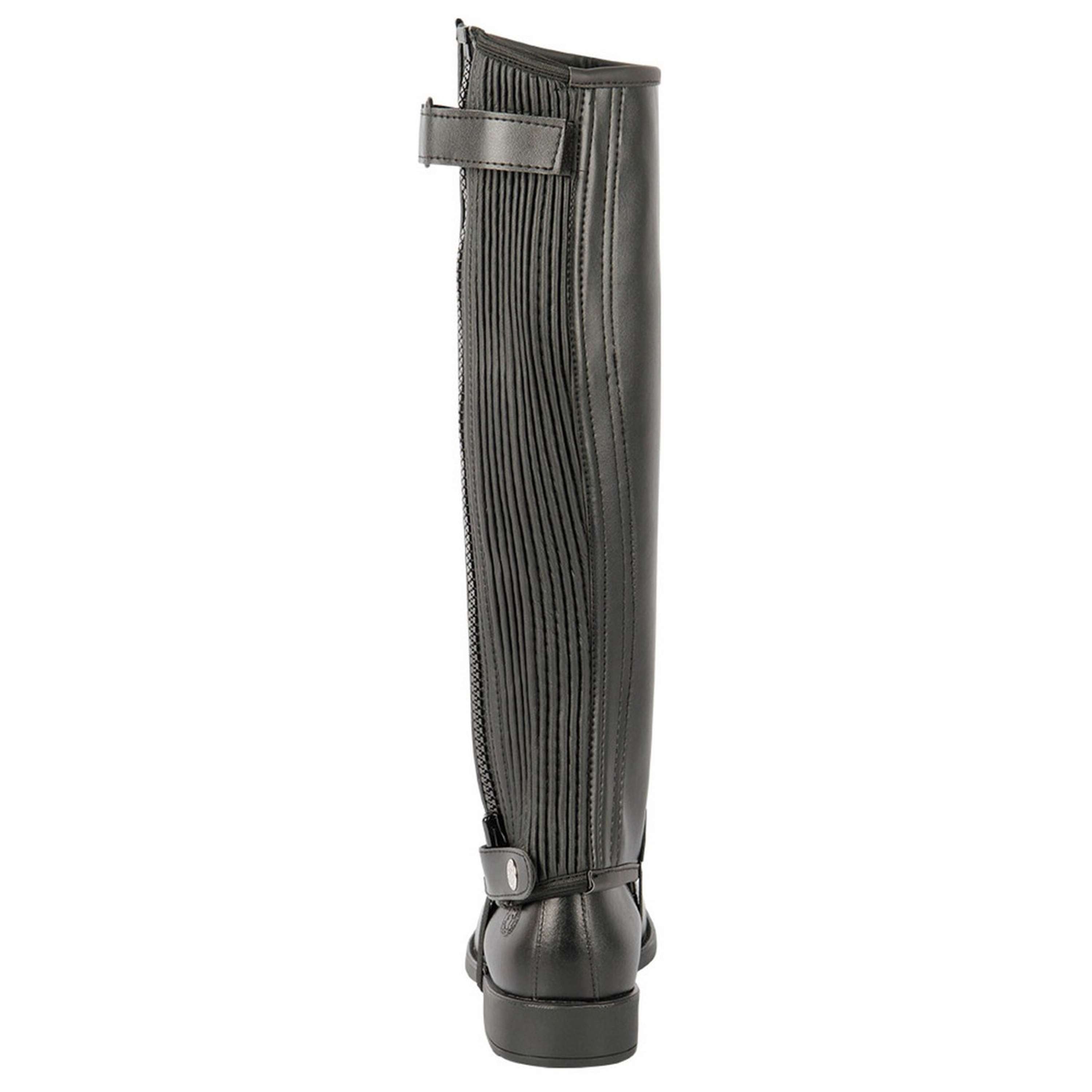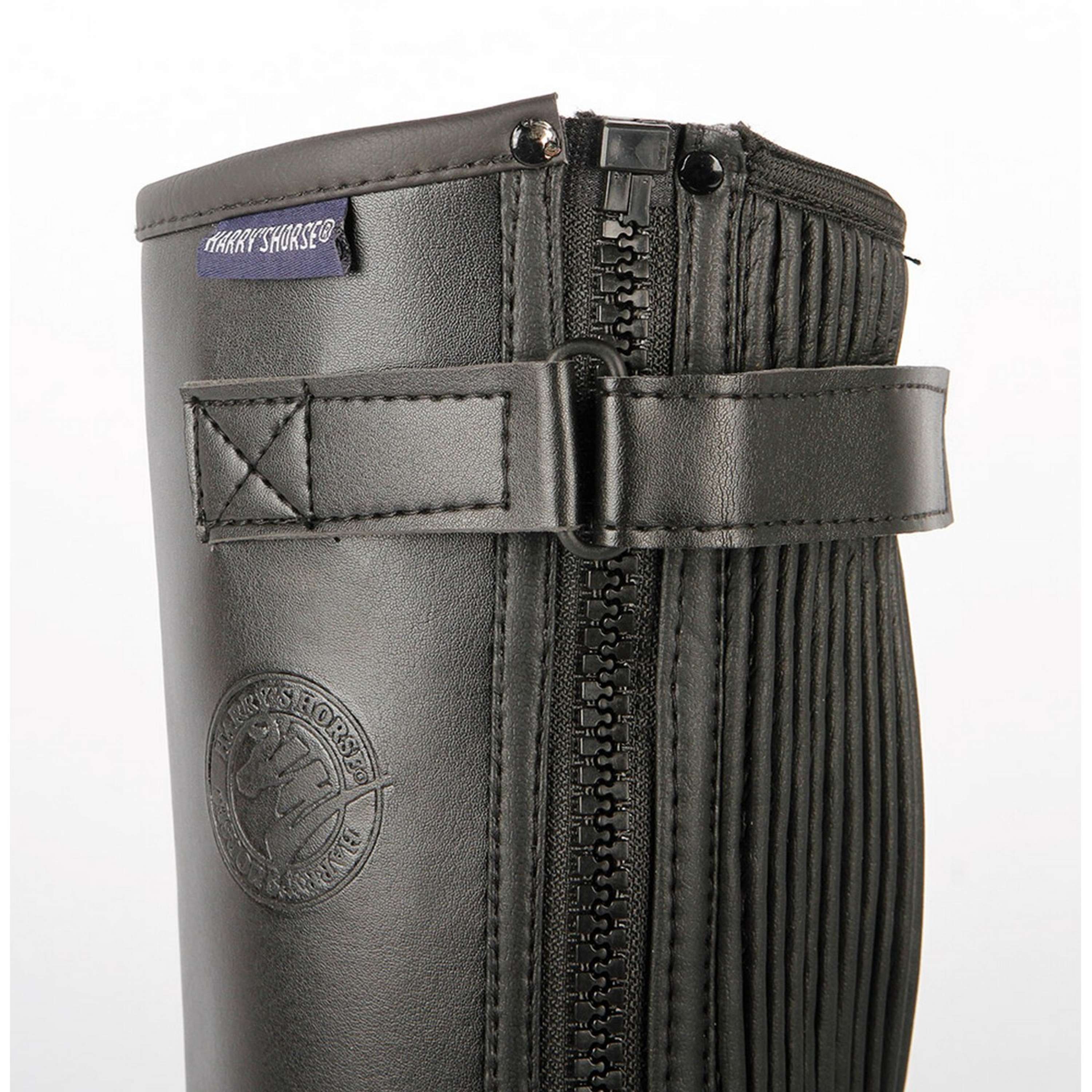 Minichaps con pantorrilla elástica y cremallera exterior. Fabricados en PU transpirable. Los chaps son totalmente lavables a máquina a 30 °C en ciclo normal. ¡No secar en secadora!
