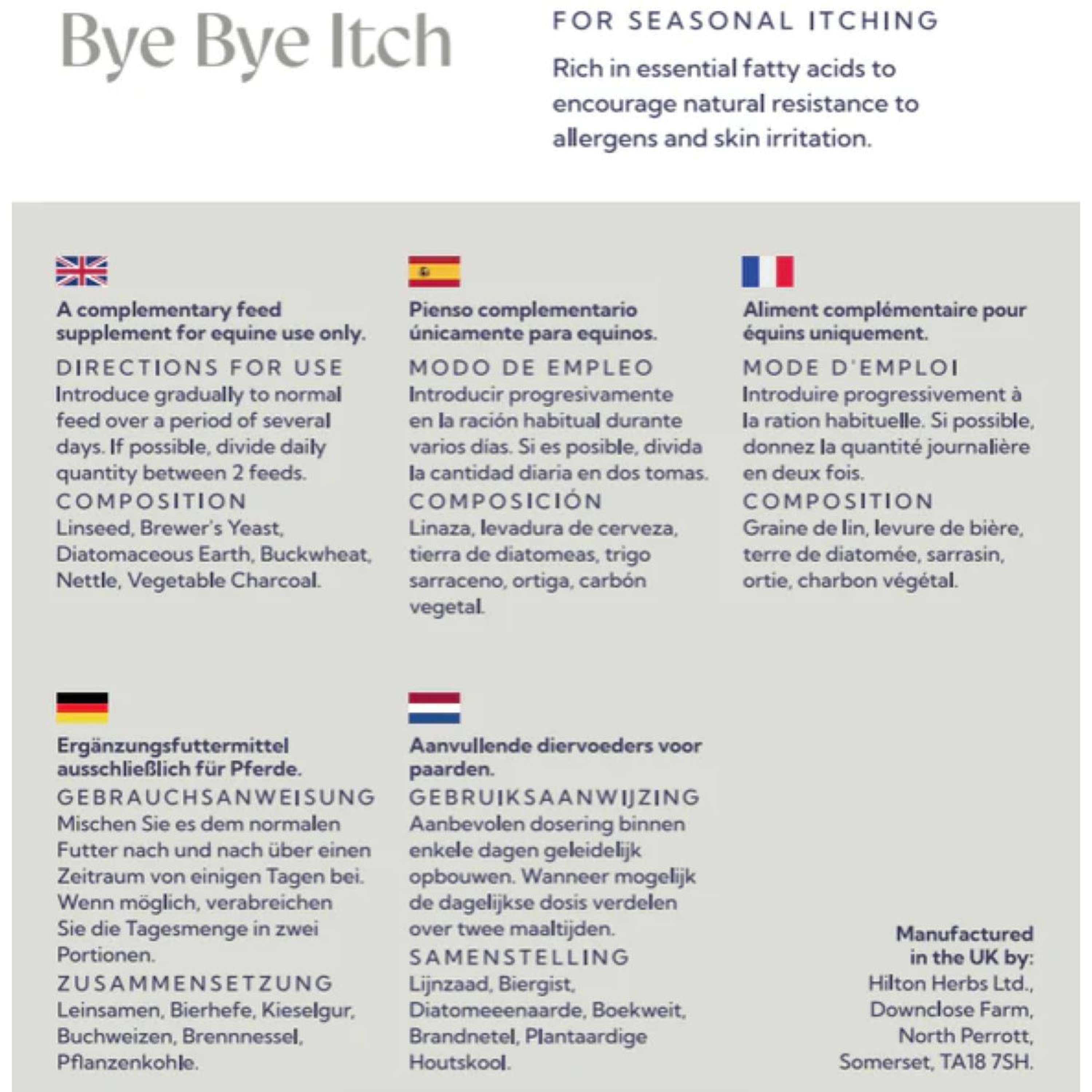 ¡Los caballos también tienen sus días de picor, no hay duda! Para ellos, aquí tienes las Hierbas Bye Bye Itch de Hilton Herbs, un suplemento que se encarga de mantener su piel en perfecto estado. Este producto está diseñado especialmente para esos equinos que sufren con la molesta picazón, ayudando a cuidar su piel y su pelaje de manera natural y efectiva.