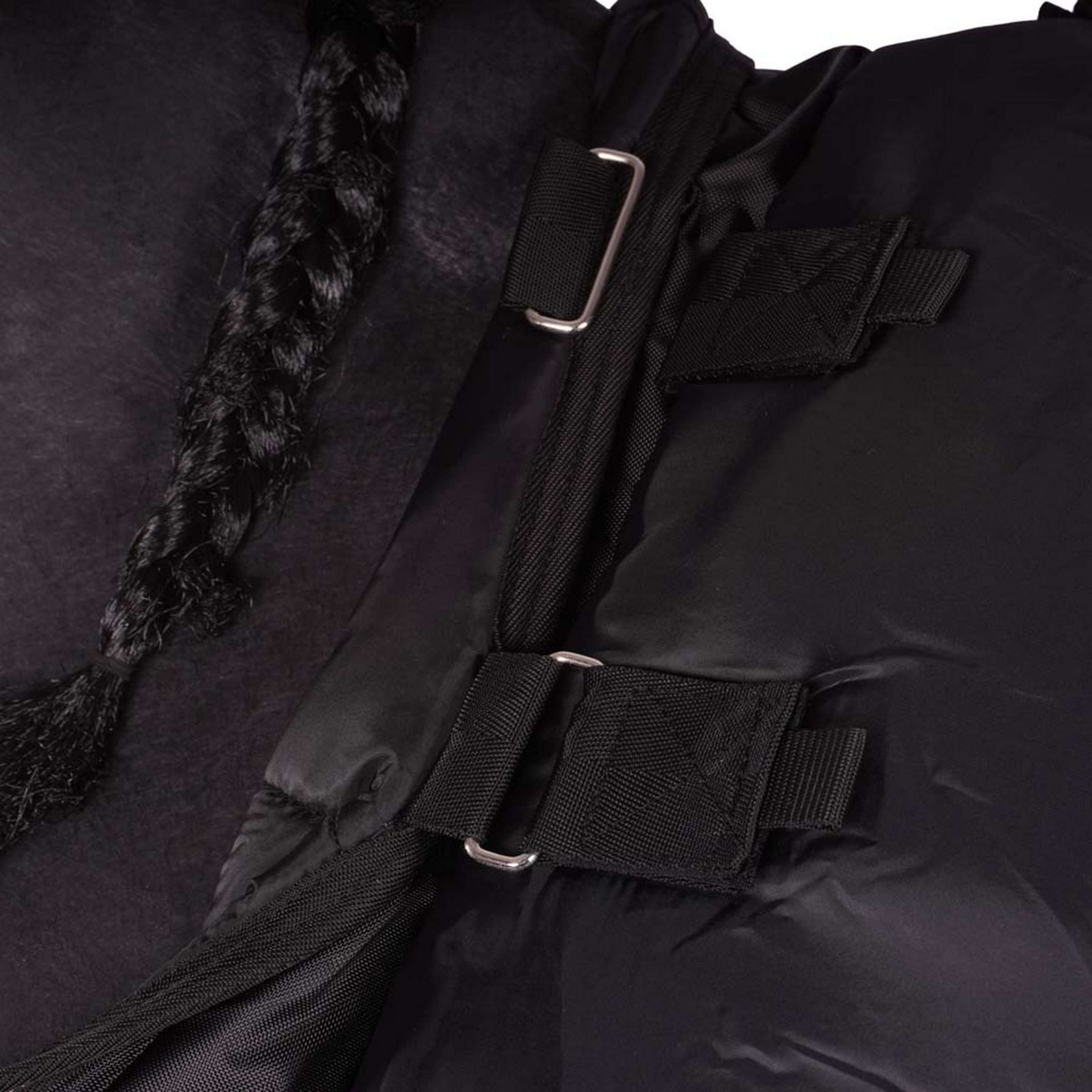 Diseñado para caballos de trote. Exterior de poliéster 840D impermeable y transpirable y forro de poliéster que realza el brillo. Corte original clásico, cierres frontales dobles, arcos delanteros de doble pierna, cinchuelos cruzados, incluido el cubrecuello y la correa de la cola.