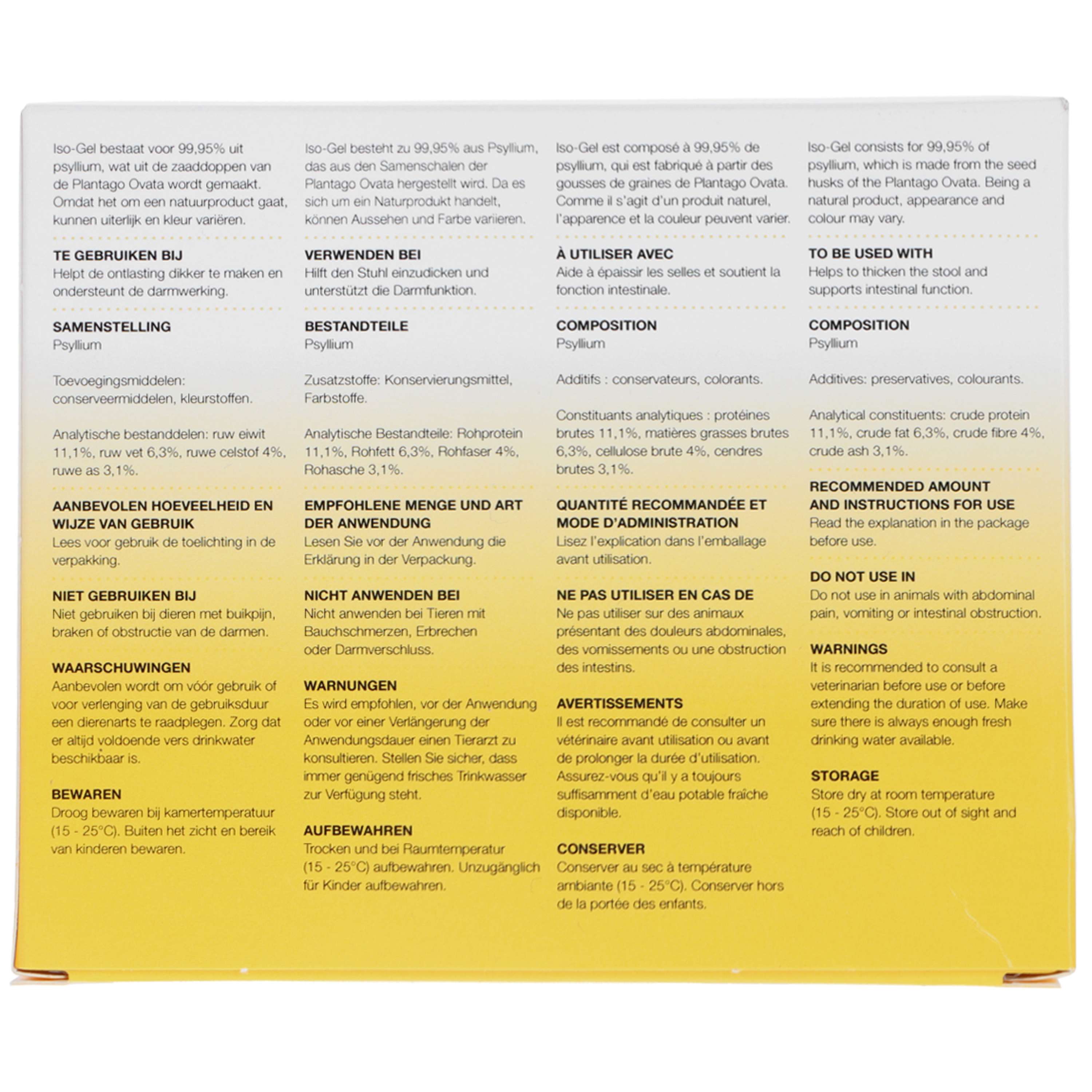 Perros: 2-5 cucharaditas de 3 ml, una o dos veces al día. Gatos: 2 cucharaditas de 3 ml, una o dos veces al día. Ingredientes: 90 % de ispágula, E223, E127, E218, E216 y fósforo. Isogel no contiene gluten ni calorías.