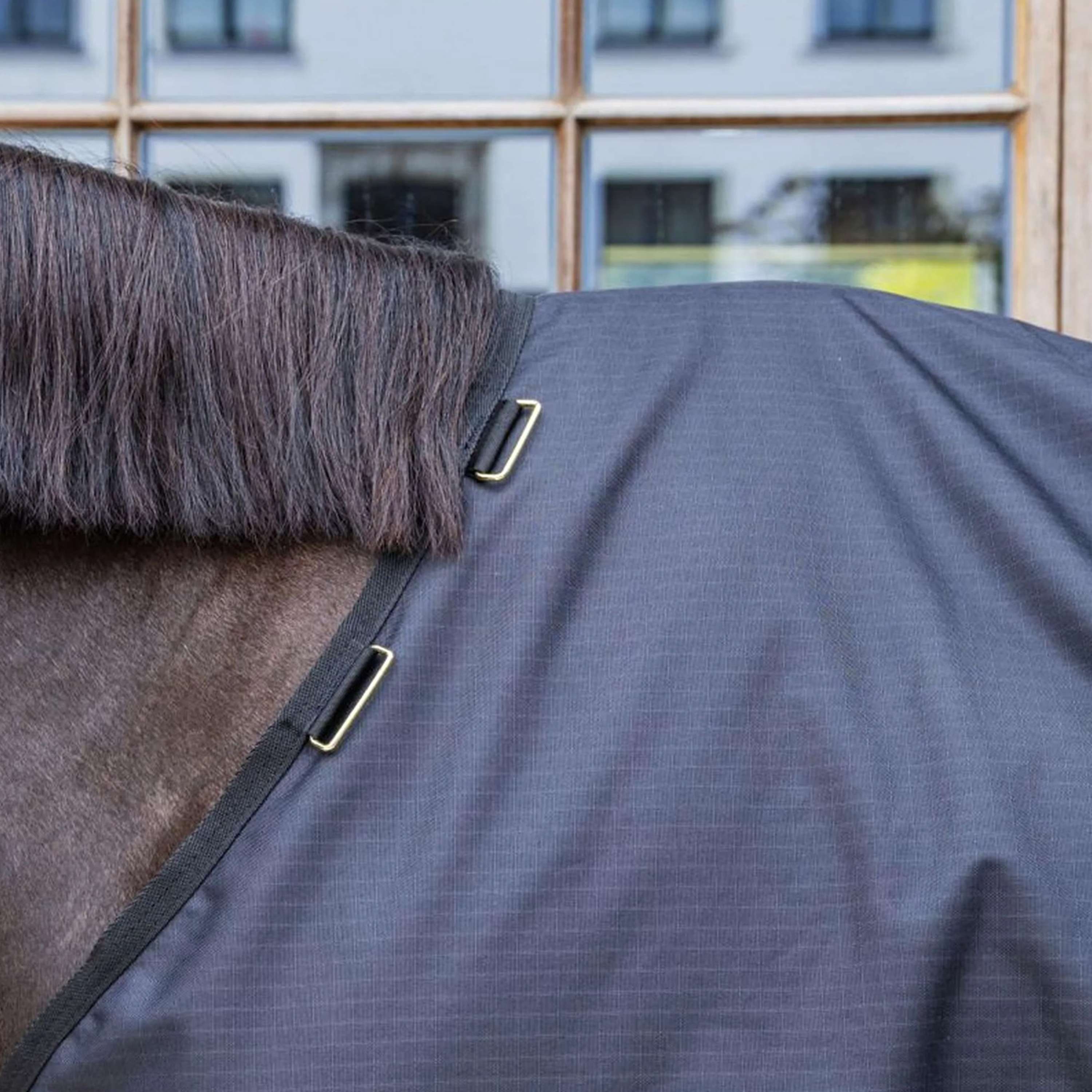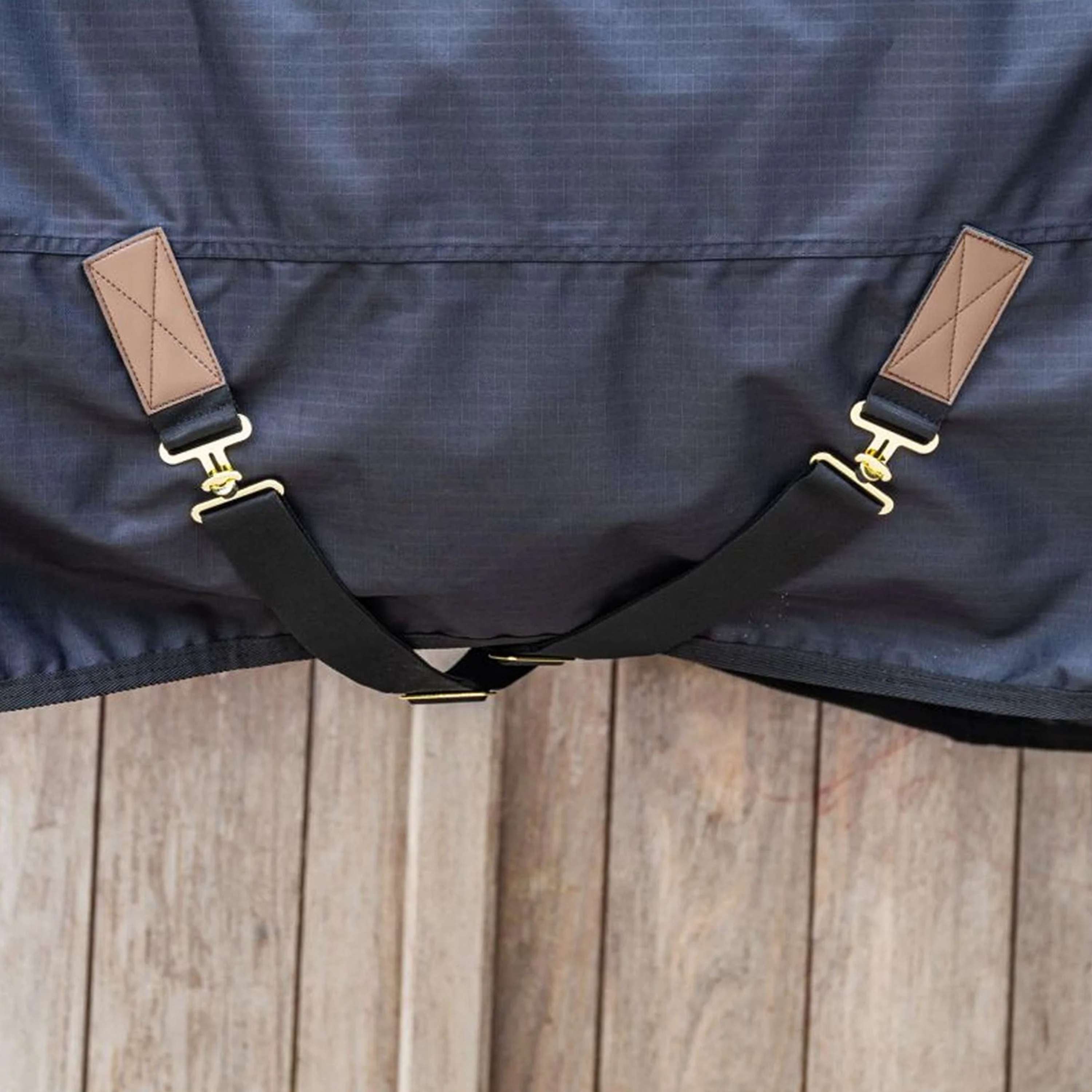 La manta de exterior cuenta con un exterior de poliéster antidesgarro 600D con un revestimiento impermeable y transpirable. Esta estructura la hace altamente resistente al desgarro. El forro de la manta es de poliéster 210T suave y antibacteriano. El forro es fácil de mantener, no retiene olores ni atrapa el pelo. La combinación de materiales garantiza que tu caballo se mantenga abrigado y seco en cualquier clima.
