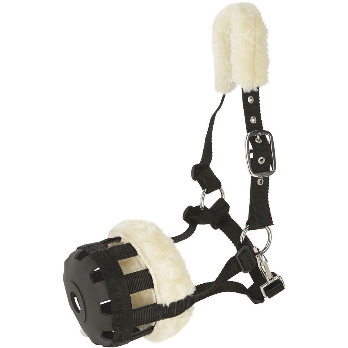 Este bozal está fabricado con un forro de peluche suave, ofreciendo un ajuste cómodo y evitando rozaduras en la cabeza de tu caballo incluso durante largos periodos de uso.