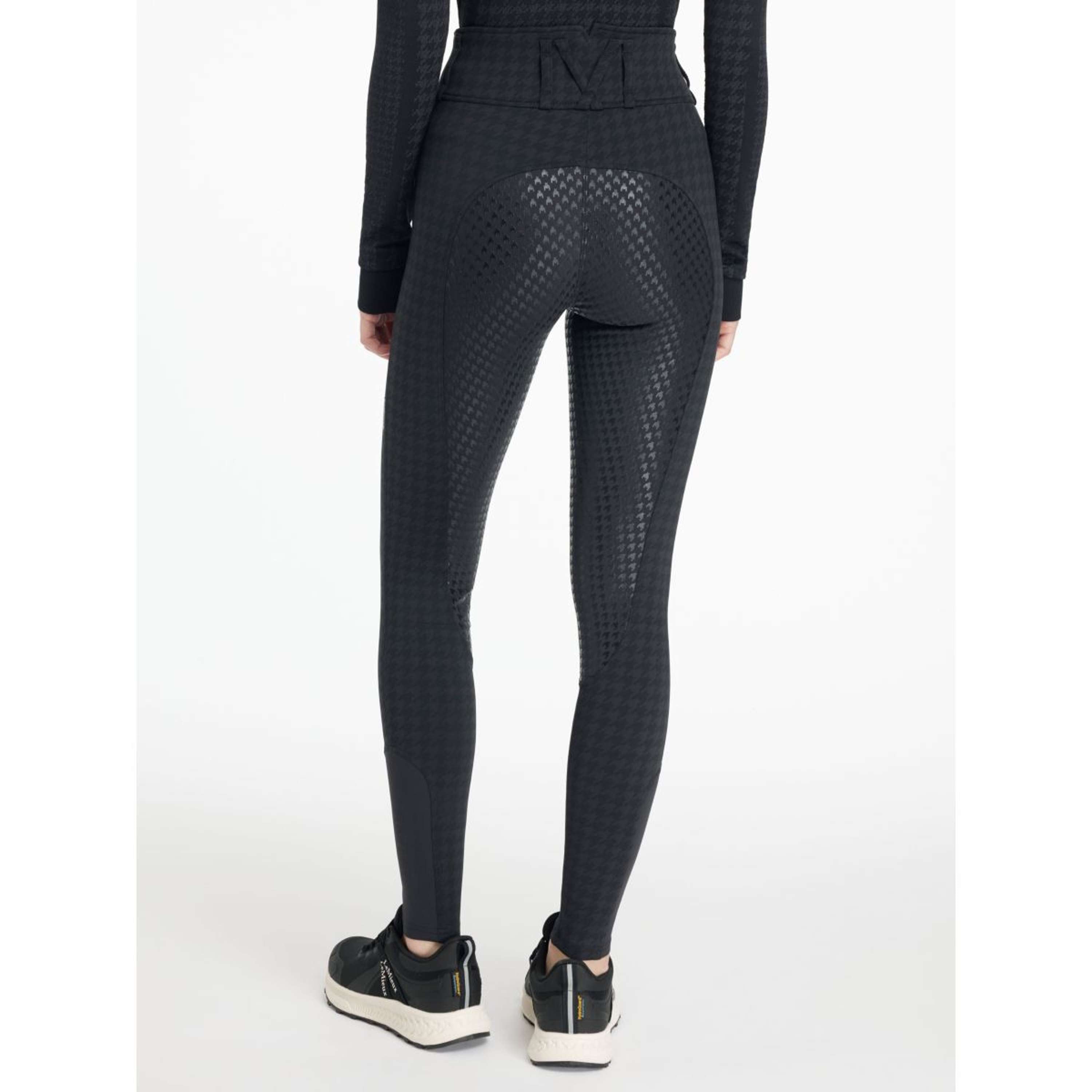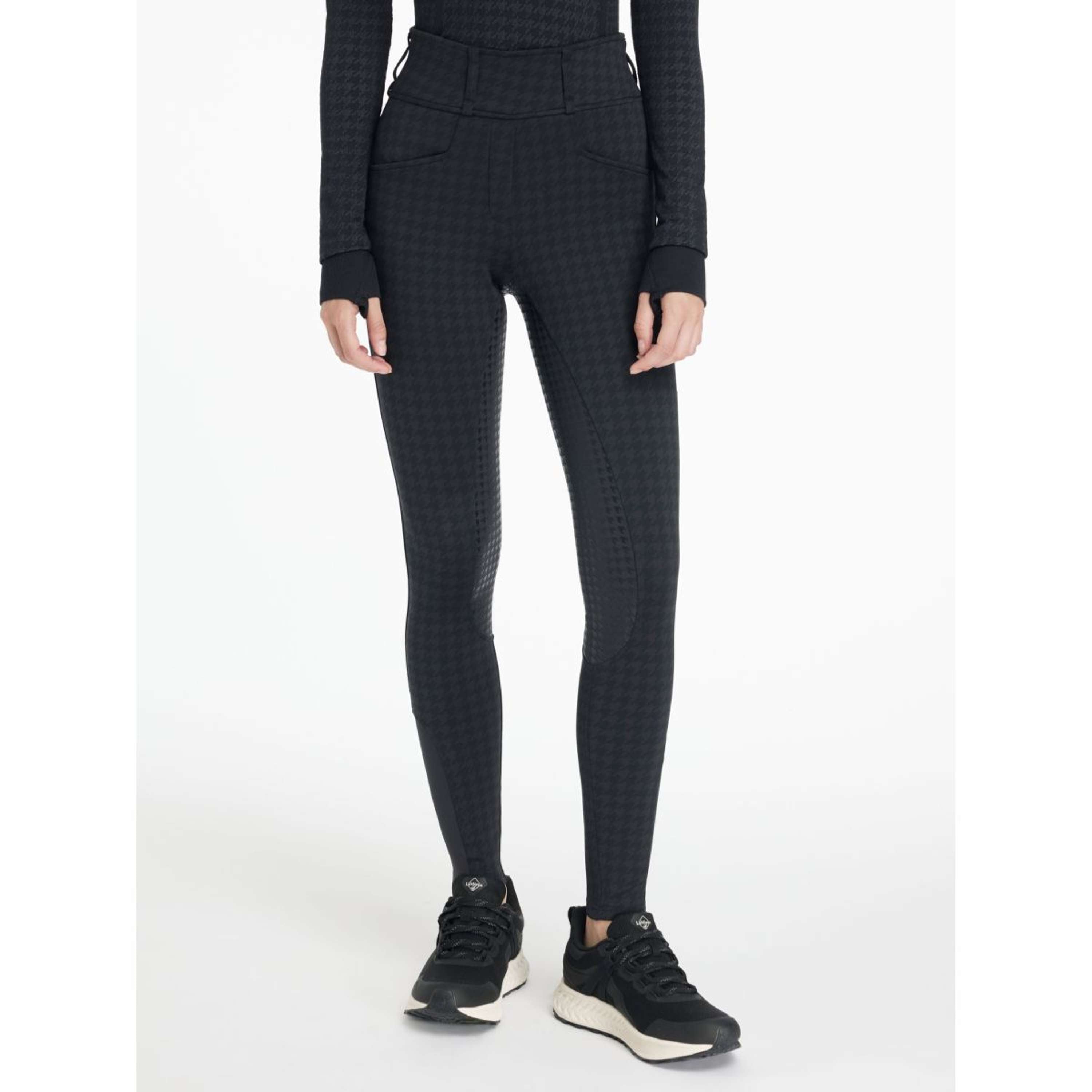 Supera todos tus retos con estos preciosos pantalones de talle alto. Ofrecen toda la comodidad de unos leggings, con la estructura y los acabados de unos pantalones de montar. Su cómodo diseño de talle alto incluye una trabilla cruzada en la parte central de la espalda. El tejido pata de gallo está diseñado para mantenerse en su sitio y proporcionar un soporte favorecedor donde se necesita. Las agarraderas de silicona en todo el asiento mejoran la estabilidad y el agarre en el sillín. La parte inferior de la pierna de los LeMieux está cortada a láser para reducir el volumen bajo las botas.