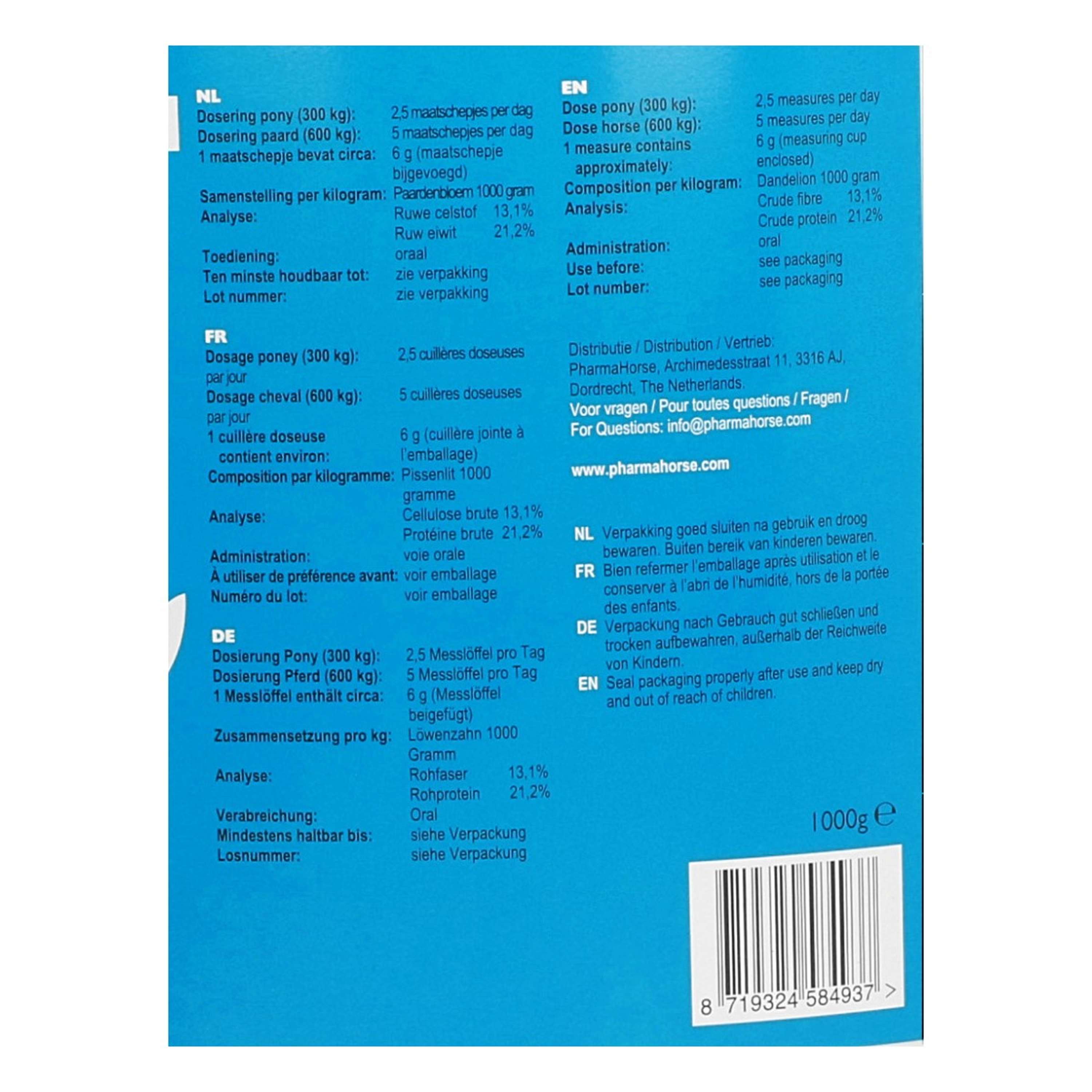 Este suplemento está elaborado exclusivamente con raíz de diente de león pura y sin aditivos. Es completamente natural, ofreciendo una opción segura y saludable para apoyar el bienestar de tu caballo.