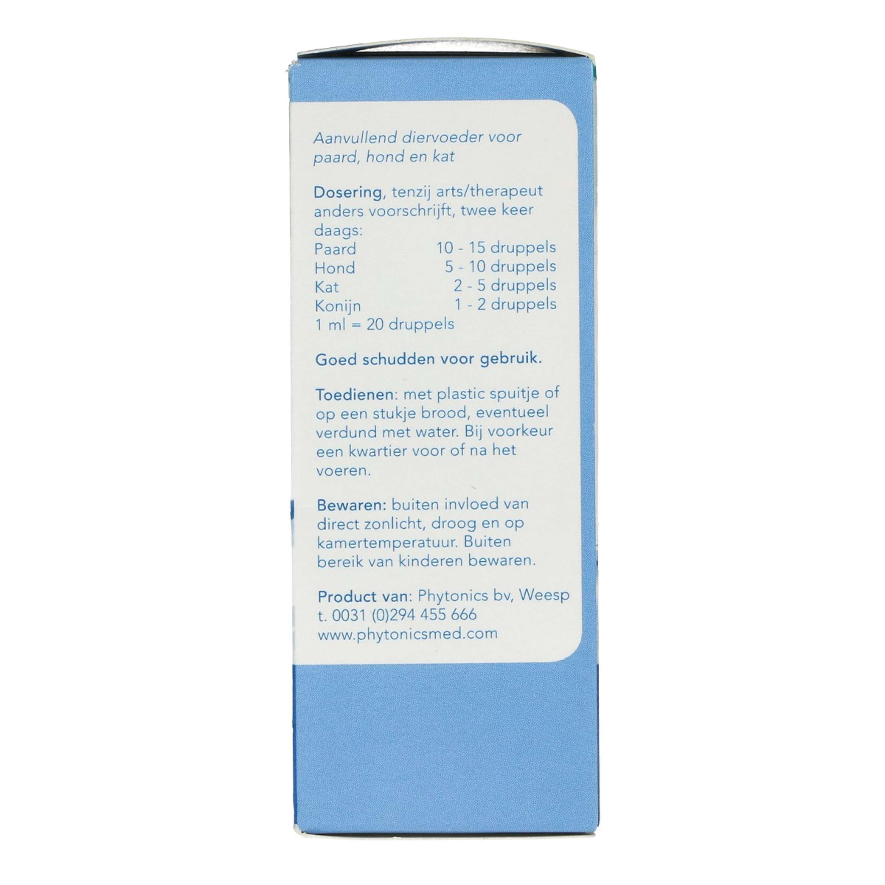 Varios productos de la serie Phytonics están disponibles en envases veterinarios (azul) y humanos (verde). Lanzado en 2010 para animales, pronto surgió la demanda de los mismos productos para humanos. El contenido es el mismo, solo la etiqueta es diferente debido a la normativa vigente. En el futuro, nos gustaría simplificar esto y optar por una etiqueta veterinaria o humanitaria. Dentro de la serie Phytonics, todos los ingredientes son de calidad humana. Los productos fitoterapéuticos son aptos para cualquier ser vivo. Como regla general, la sensibilidad a estas sustancias es la misma en humanos y caballos, independientemente de su peso. La dosis para adultos es la misma que para caballos. La dosis para niños de 6 a 12 años es apta para perros y gatos. Por supuesto, también se requiere suplementación según sea necesario. Vigile atentamente la reacción del animal a las gotas y ajuste la dosis si es necesario.