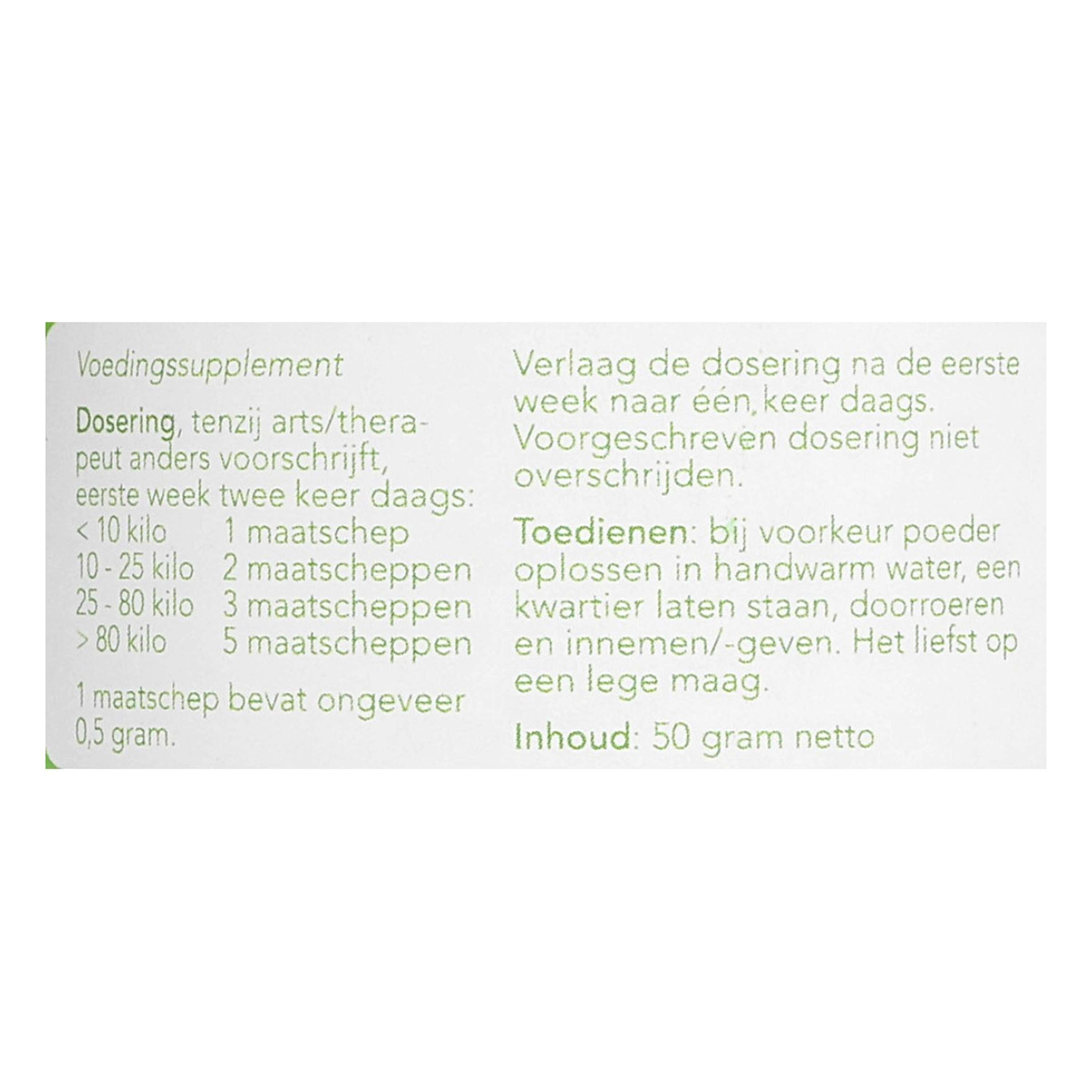 Tras la mejoría, se puede utilizar una dosis de mantenimiento. Esta suele ser la mitad de la dosis indicada en el envase. Al dosificar este producto, observe atentamente la reacción de su animal. Inicialmente, puede ser necesaria una dosis mayor; este producto se puede duplicar con seguridad. Cuando se produzca una mejoría, reduzca gradualmente la dosis hasta la mínima posible. Algunos animales pueden experimentar un breve empeoramiento u otra reacción grave al inicio del tratamiento. En caso de un aumento grave, reduzca la dosis a la mitad o suspenda temporalmente el tratamiento y luego auméntela gradualmente. Preferiblemente, disuelva el polvo en agua tibia, déjelo reposar quince minutos, remueva y luego tómelo/administre. Preferiblemente en ayunas.