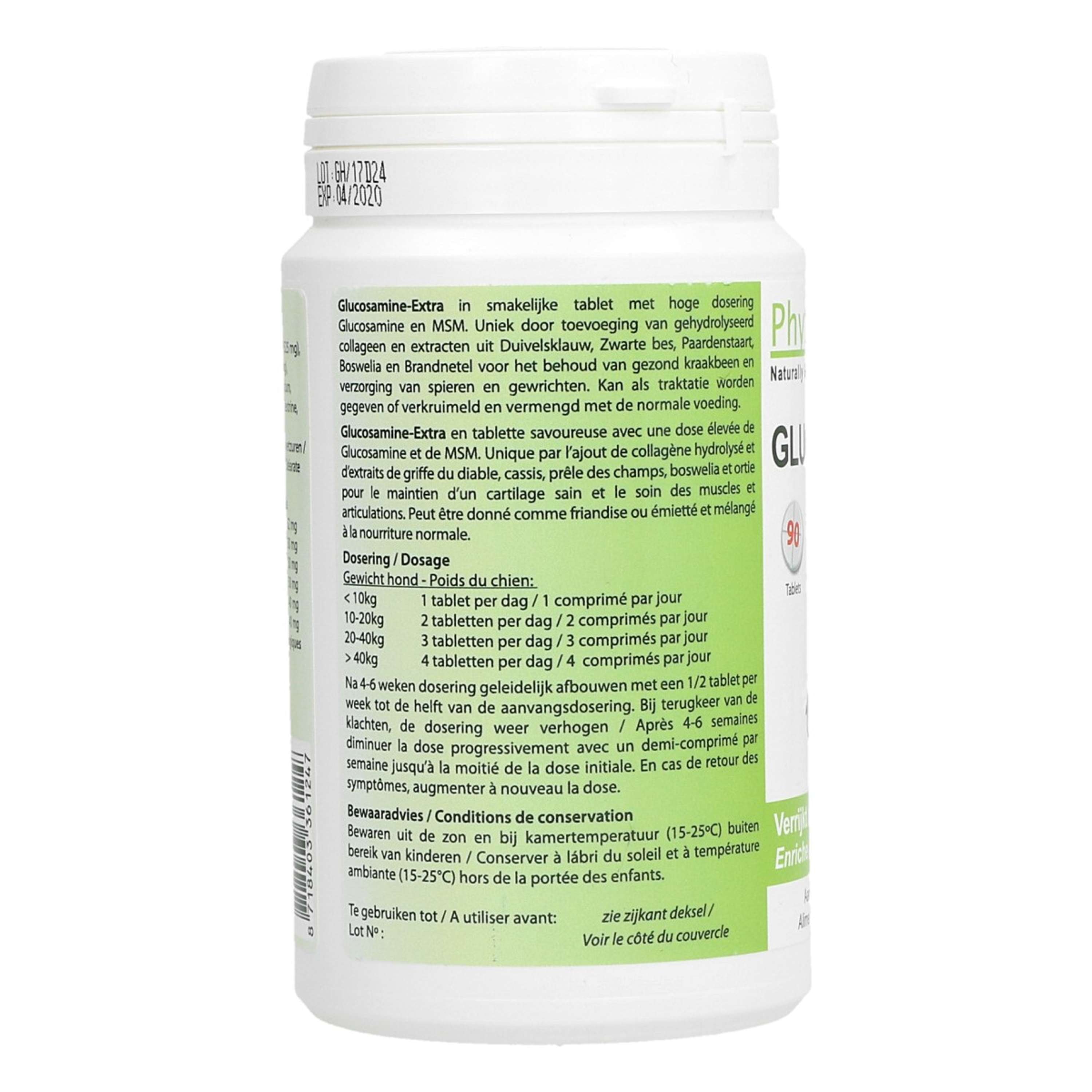 PhytoTreat Glucosamina-Extra es un alimento complementario para mascotas que promueve la flexibilidad articular de los perros. Contiene una alta dosis de glucosamina y MSM. Sus propiedades únicas incluyen colágeno hidrolizado y extractos vegetales beneficiosos. La glucosamina es un componente esencial para el desarrollo y mantenimiento del cartílago articular. El MSM (metilsulfonilmetano) es una fuente natural de azufre orgánico. El azufre contribuye a la producción de colágeno, un componente clave del cartílago y el tejido conectivo. Solo en dosis altas se ha demostrado que estas sustancias contribuyen al mantenimiento de la función articular. PhytoTreat Glucosamina-Extra también contiene colágeno hidrolizado natural y extractos de harpagofito, grosella negra, cola de caballo, boswellia y ortiga para un mayor mantenimiento y cuidado de los músculos y la flexibilidad articular.