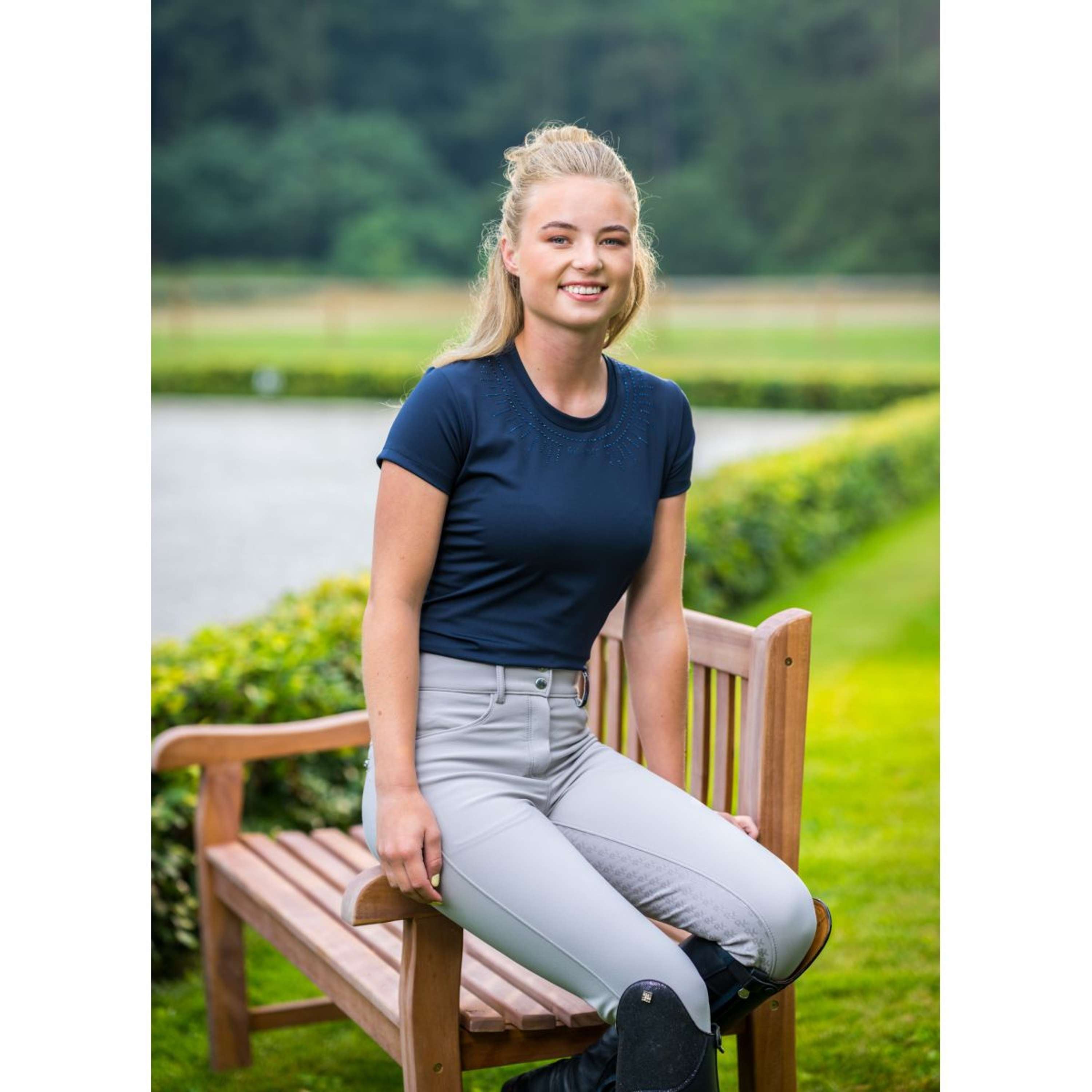 Camiseta de Meryl hecha de tela transpirable y elástica para máxima comodidad y libertad de movimiento. Acabado con estilo con piedras tonales y brillantes alrededor del cuello para un sutil brillo. Un básico elegante y deportivo que es fácil de combinar, ideal tanto para el entrenamiento como para el ocio.