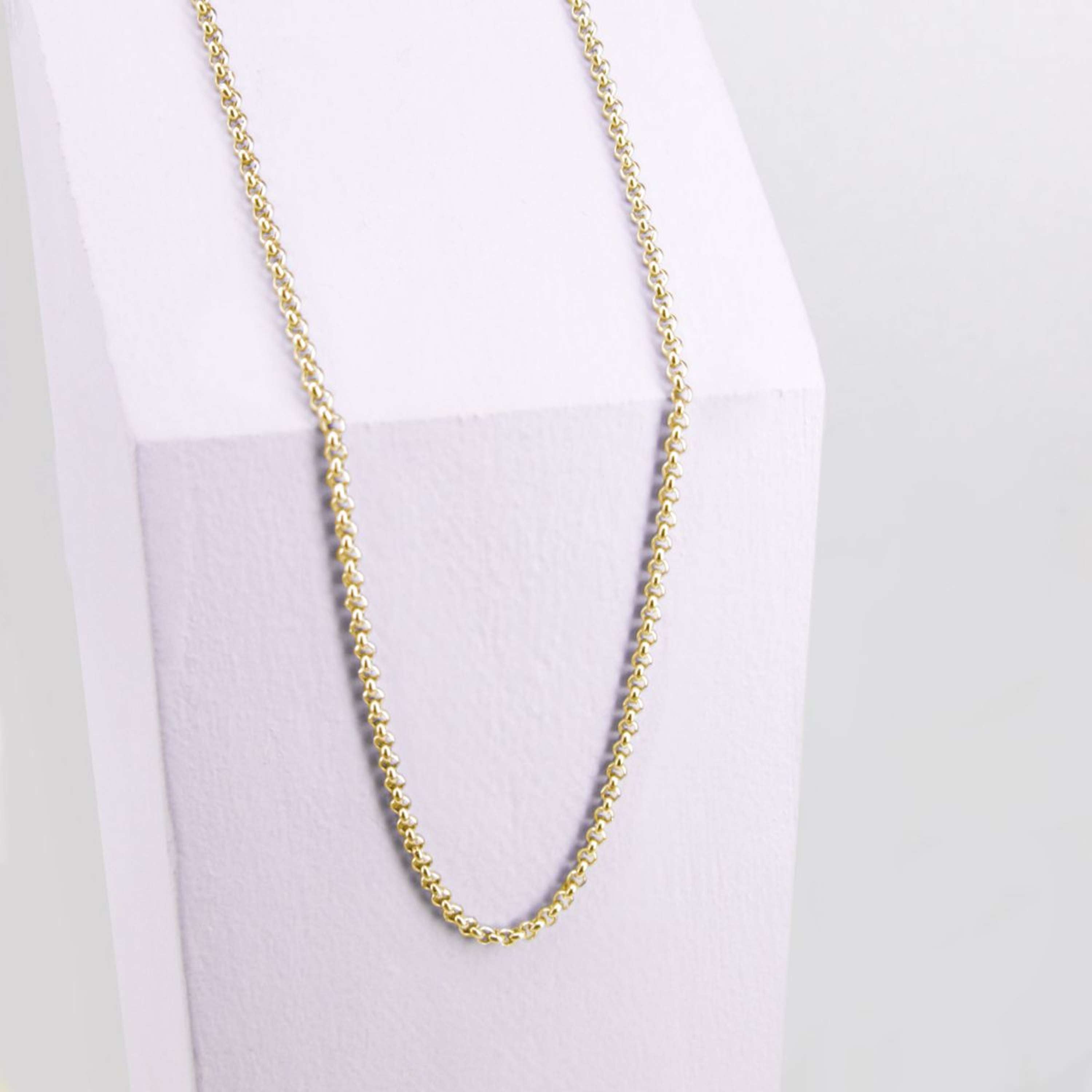Esta cadena destaca por su enlace redondo, que aporta un estilo limpio y contemporáneo. Con su acabado pulido, se convierte en un complemento ideal para cualquier ocasión, ya sea una cita especial o un día casual.