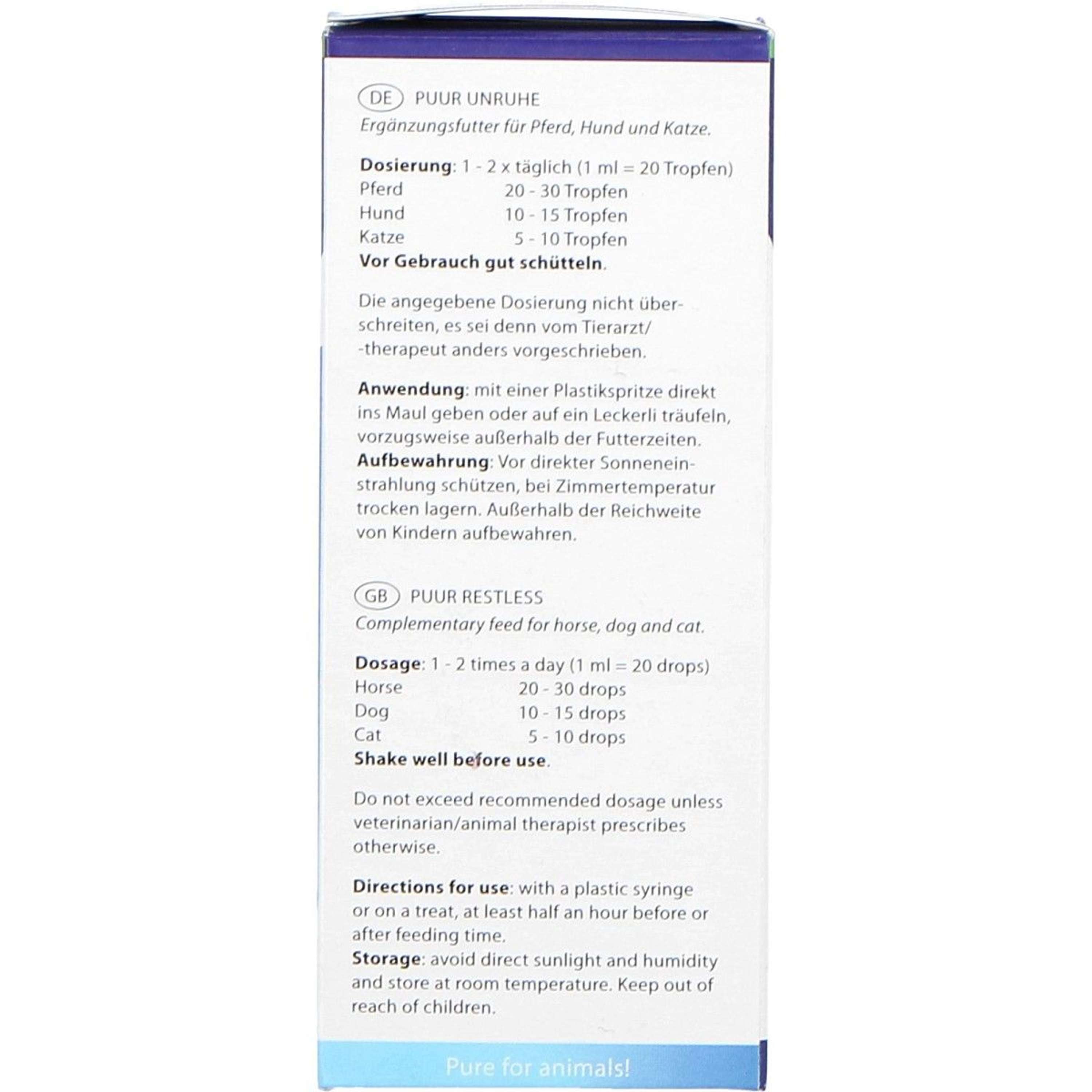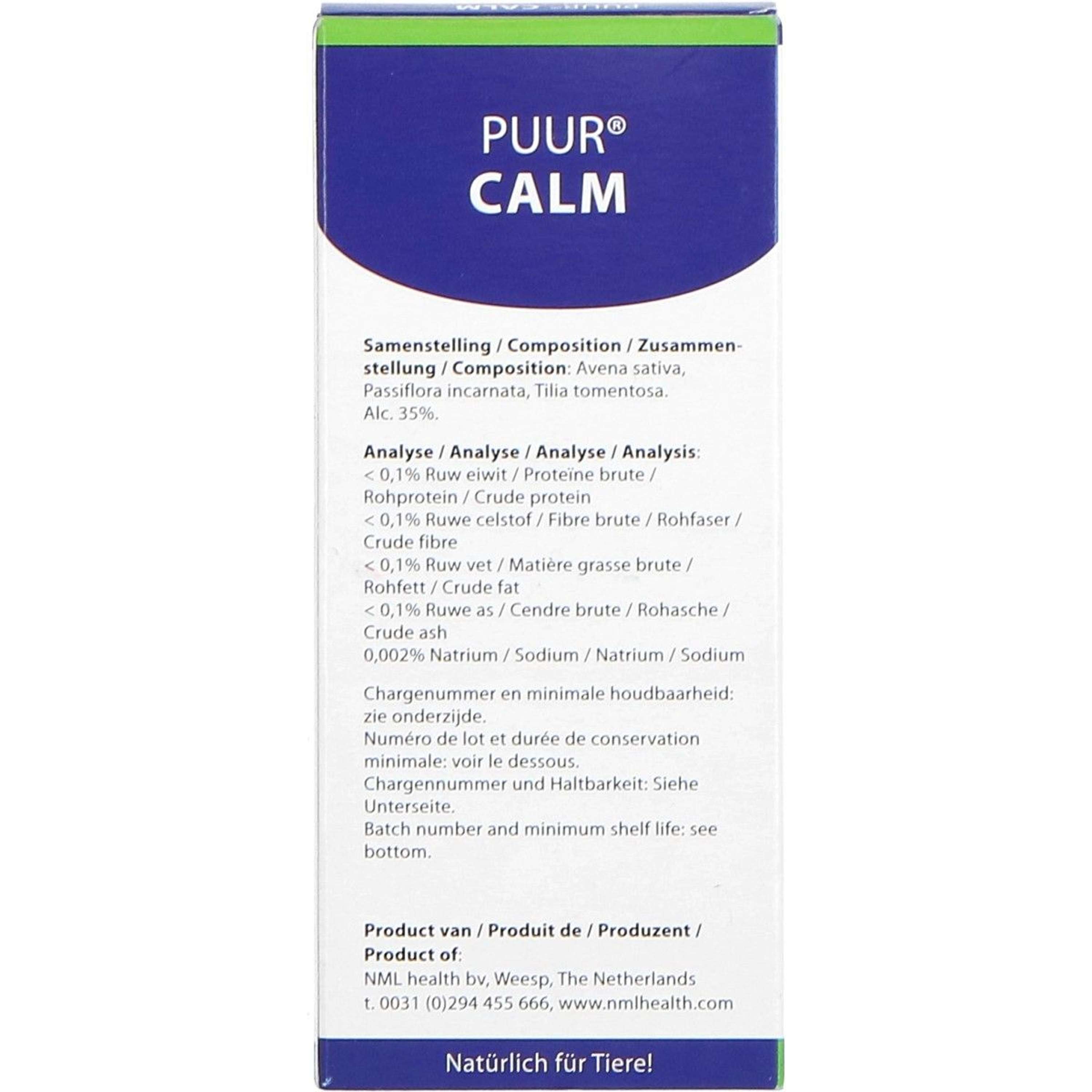 Agitar bien antes de usar. Si resulta difícil administrar este producto varias veces al día en la práctica, una vez al día o una vez cada dos días es suficiente. En ese caso, administrar la dosis máxima para un día. PUUR Calm aún puede usarse eficazmente, pero la respuesta puede tardar un poco más. Tras la mejoría, se puede utilizar una dosis de mantenimiento. Esta suele ser la mitad de la dosis indicada en el envase. Al dosificar este producto, vigile atentamente la reacción de su animal. Puede ser necesaria una dosis mayor inicialmente; este producto se puede administrar con seguridad al doble de la dosis. Cuando se produzca una mejoría, reducir gradualmente la dosis hasta la mínima posible. Con algunas diluciones y extractos, puede producirse un breve empeoramiento al inicio del tratamiento. Esto significa que el animal está reaccionando al producto. En caso de un aumento brusco, reduzca la dosis a la mitad o suspenda temporalmente la administración y luego auméntela gradualmente. Administre este producto directamente en la boca con una jeringa de plástico, diluido con un poco de agua si es necesario. Preferiblemente, no lo use junto con una comida, ya que el producto funciona mejor si se absorbe por la mucosa oral limpia. Si al animal no le gusta el producto, se pueden administrar las gotas en un pequeño bocado de golosina. Agua, glicerina(e), Avena sativa, Passiflora incarnata, Tilia tomentosa. Alcohol 30%