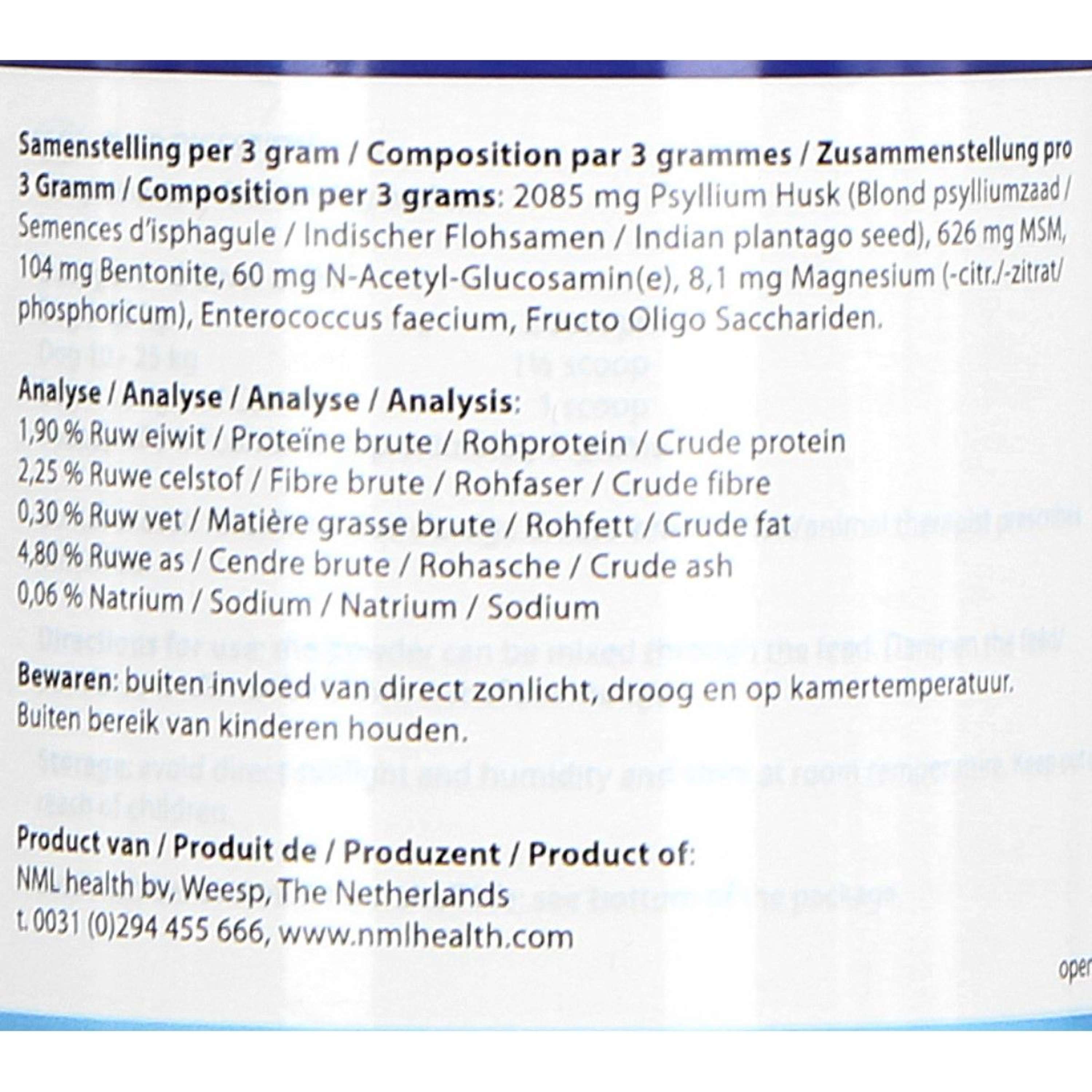 Tripas de semillas de Pylus/ Cosses de graines d'herbe aux puces/ Flohsamen shells/ Psyllium husk, Metilsulfonilmeta(a)n(e), N-Acetil-Glucosamina(e), FOS (Fructo Oligosacárido(s)), Magnesio citra(a)t/ Citrato de magnesio, Fosfato de manesio/ Fosfato de magnesio/ Fosfato de magnesio/ Fosfato de magnesio.