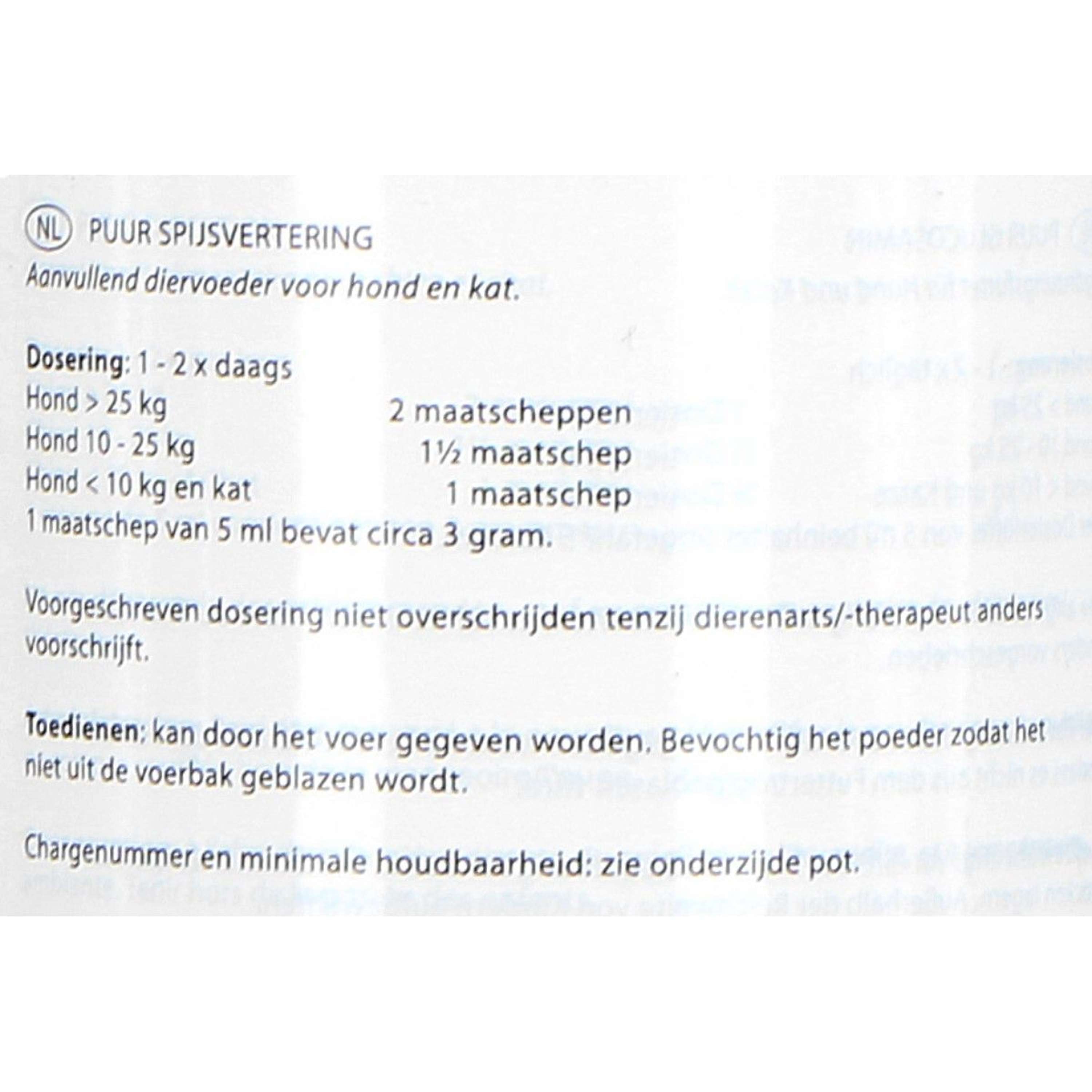 Este producto puede aliviar la flatulencia y contiene el equilibrio adecuado de fibra, bacterias intestinales y minerales. PUUR Digest se utiliza para las molestias causadas por la ingestión de cuerpos extraños y las reacciones a ciertos nutrientes. PUUR es una gama completa de productos para la salud de perros, gatos y caballos. Los productos se basan en la fitoterapia y la medicina ortomolecular, y están elaborados con materias primas naturales. 2 veces al día: Perros de más de 25 kg: 2 cacitos dosificadores. Perros de 10 a 25 kg: 1½ cacitos dosificadores. Perros de menos de 10 kg: 1 cacito dosificador. Una cacito dosificador contiene aproximadamente 3 gramos. Si resulta difícil administrar este producto varias veces al día, basta con una vez al día o cada dos días. En ese caso, administrar la dosis máxima para un día. Aun así, este producto es efectivo, pero la reacción puede tardar un poco más. Tras la mejoría, se puede usar una dosis de mantenimiento. Esta suele ser la mitad de la dosis indicada en el envase. Al dosificar este producto, vigile atentamente la reacción de su animal. Inicialmente, puede ser necesaria una dosis mayor; este producto se puede administrar con seguridad al doble de la dosis. Reduzca gradualmente la dosis a la mínima posible tan pronto como se produzca la mejoría. PUUR Digest se puede administrar con la comida. Dado que este polvo contiene hierbas, se recomienda comenzar con una pequeña cantidad para que su animal se acostumbre al sabor. Humedezca el polvo para que no se salga del comedero. En caso de estreñimiento, adminístrelo con abundante agua y asegúrese siempre de tener suficiente agua potable fresca disponible. Mientras que muchos productos que contienen psyllium contienen las semillas enteras, PUUR Digest contiene solo la cáscara de estas semillas, que concentra los ingredientes activos (mucílago y fibra soluble). También disponible en 600gr.