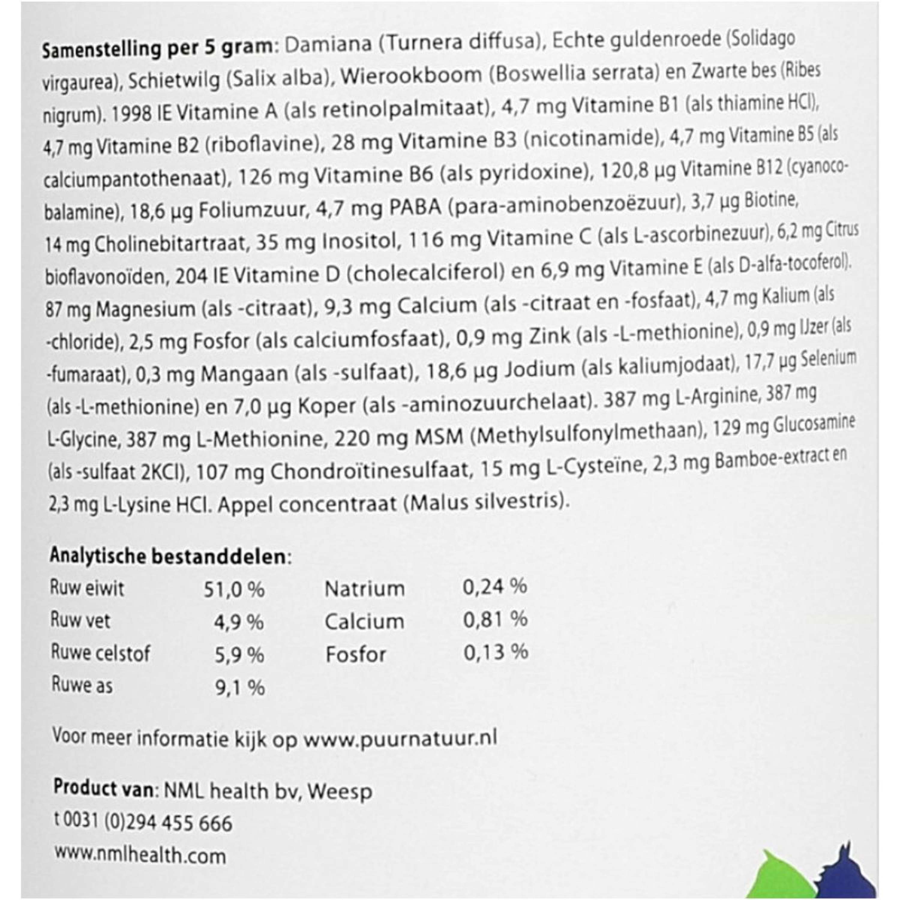 Al observar una mejoría, se puede usar una dosis de mantenimiento. Esta suele ser la mitad de la dosis indicada en el envase. Al determinar la dosis, vigile atentamente la reacción de su animal. Inicialmente, puede ser necesaria una dosis mayor; este producto se puede administrar con seguridad al doble de la dosis. Reduzca gradualmente la dosis a la mínima posible tan pronto como observe una mejoría. PUUR Muscle Mass 500 g / Muscle Building se puede administrar con la comida. Humedezca el polvo para evitar que se salga del comedero. Durante el entrenamiento, para mejorar la resistencia, tratar la debilidad muscular y la pereza en caballos jóvenes, por ejemplo, y para apoyar a los caballos mayores con pérdida de masa muscular. Composición por 5 gramos: Tunera diffusa, Boswellia serrato, Ribes nigrum, bambú. 220 mg de MSM, 129 mg de glucosamina, 87 mg de magnesio, 64 mg de condroitina, 6,2 mg de cítricos biofl, 9,3 mg de calcio, 4,7 mg de potasio, 2,5 mg de fósforo.