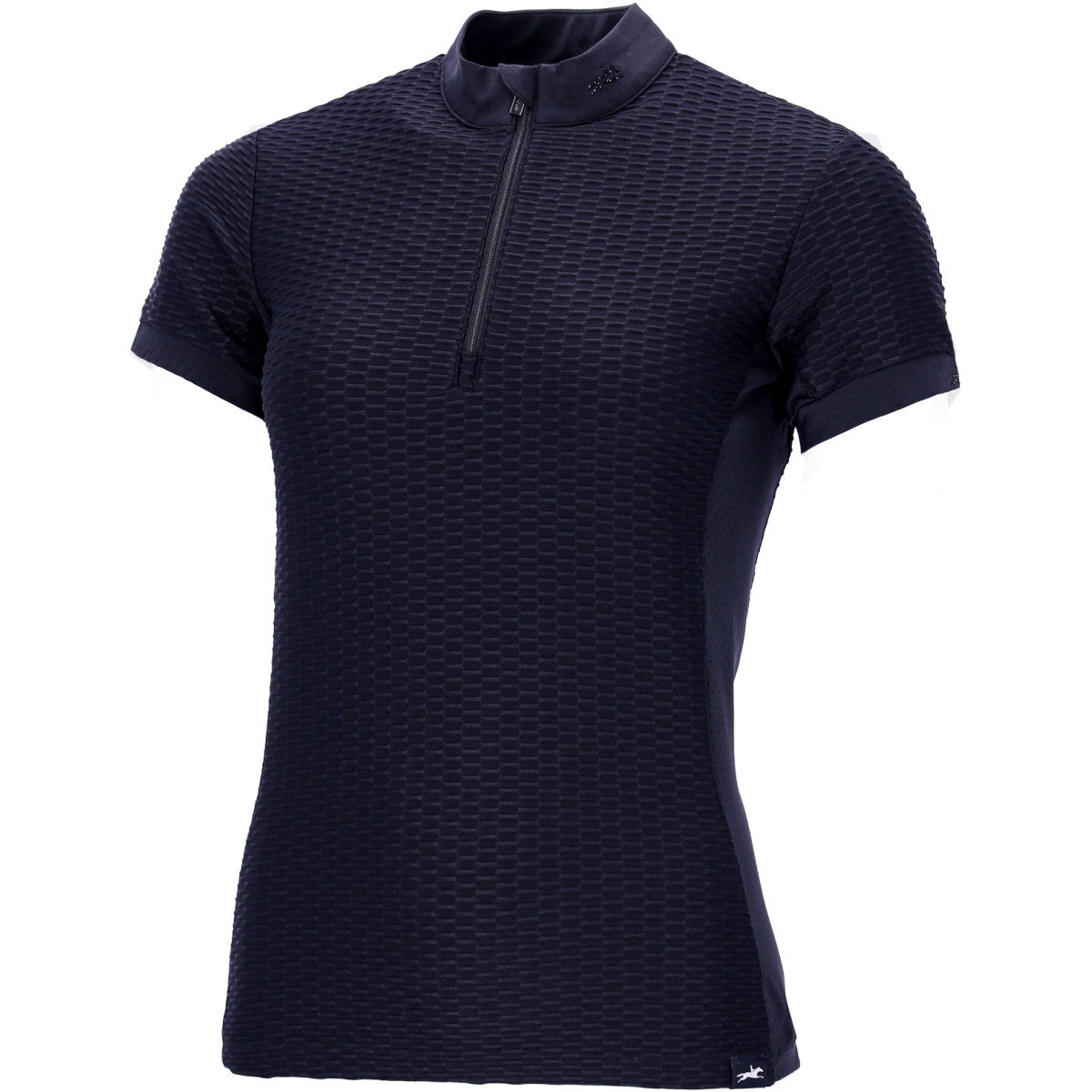 La camiseta de entrenamiento Gloria, hecha de un tejido texturizado y funcional, presenta un cuello alto con un brillante logo de pedrería y paneles laterales lisos para una comodidad óptima. Las mangas con ribetes y el logo de pedrería de caballo añaden detalles elegantes.