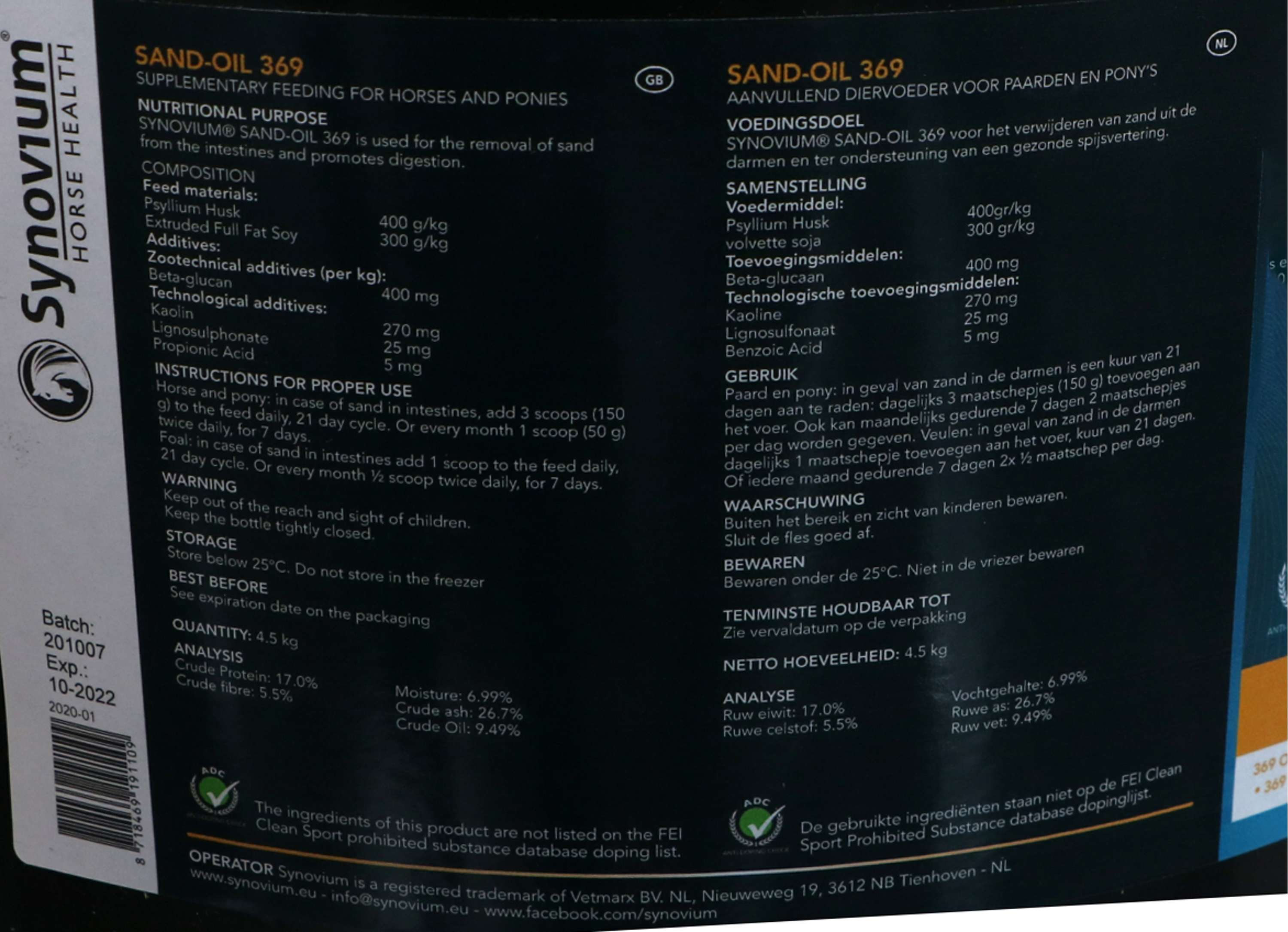 Potro: Para prevención, administrar 25 g dos veces al día durante 7 días cada mes. En caso de arena en los intestinos, administrar 50 g al día durante 21 días. Dividir la dosis en al menos dos comidas.