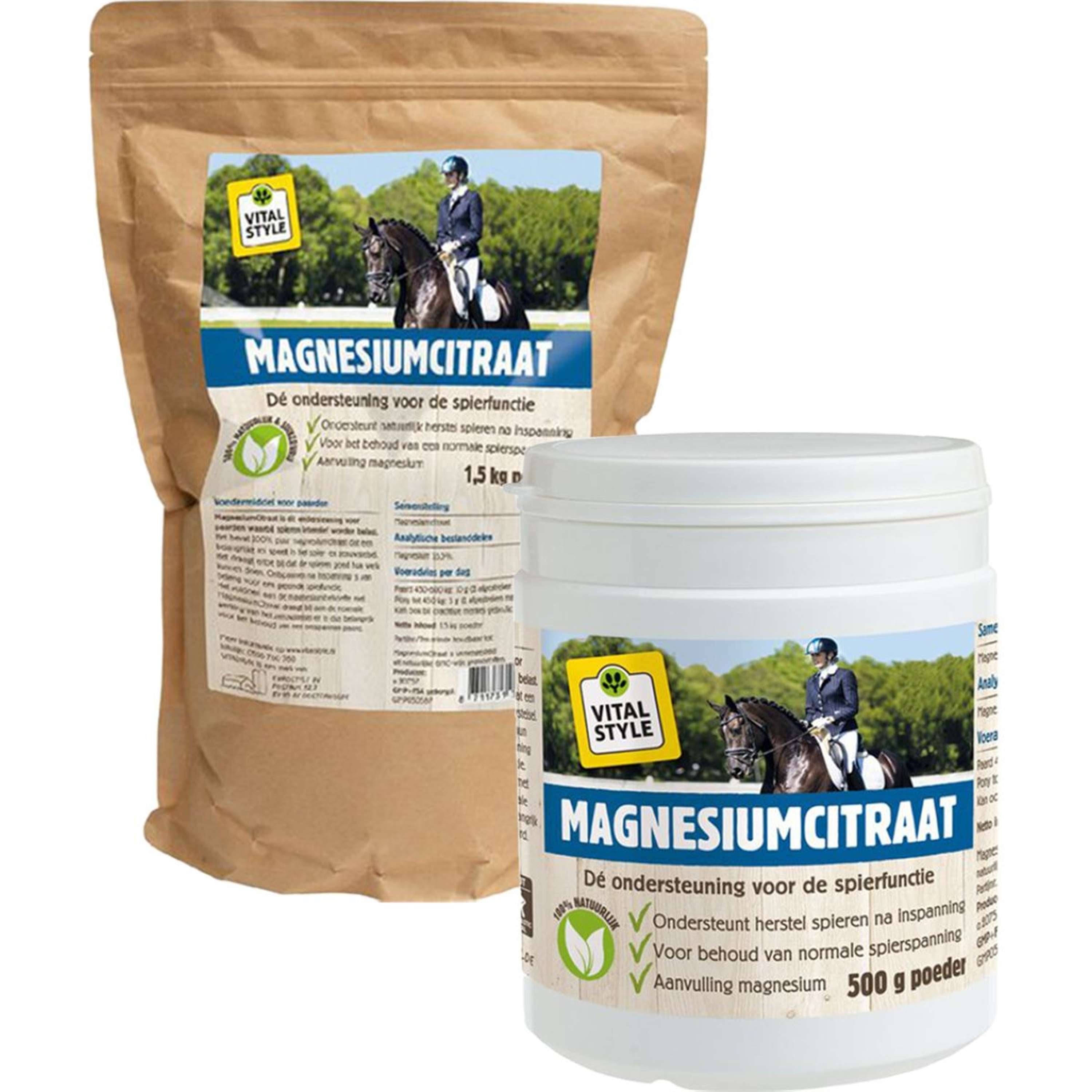 5 gramos de citrato de magnesio contienen aproximadamente 600 mg de magnesio elemental. El citrato de magnesio es natural, no contiene OMG ni azúcares añadidos. ¿Qué contiene el citrato de magnesio? Citrato de magnesio 100% puro y natural. Esta forma de magnesio se absorbe bien en el intestino delgado. Combinado con el calcio, el magnesio también favorece la formación ósea saludable. El citrato de magnesio es magnesio (sal) unido al ácido cítrico. Este compuesto de magnesio se absorbe bien en el organismo. Consejos de alimentación: El citrato de magnesio es apto para caballos de todas las edades y puede utilizarse en yeguas preñadas. Encontrará una cuchara medidora en el envase. Una cuchara medidora rasa contiene 5 g de citrato de magnesio. Reparta el polvo sobre el pienso. Si es necesario, humedezca ligeramente el pienso para evitar que el polvo se salga del comedero.