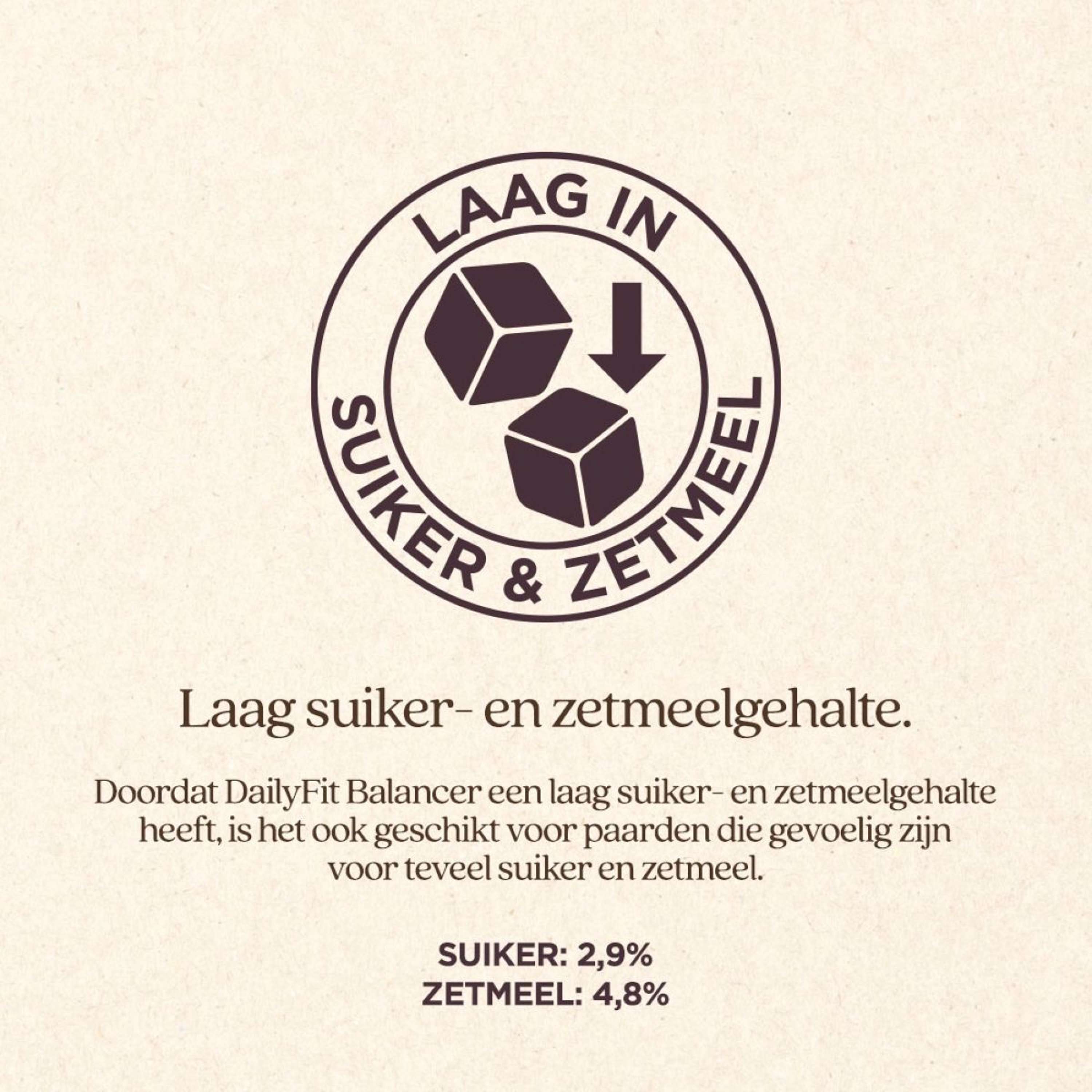 La cantidad indicada de DailyFit Balancer es una guía para las necesidades diarias de vitaminas y minerales de tu caballo. La necesidad de DailyFit Balancer puede variar y, entre otras cosas, depende del contenido de vitaminas y minerales de la ración total y de la actividad: puedes ajustar la dosis de DailyFit Balancer en consecuencia. ¿No me das concentrados? Luego da la dosis aumentada. DailyFit Balancer es adecuado para caballos de todas las edades y también puede usarse con yeguas preñadas. En el paquete encontrarás una taza medidora.