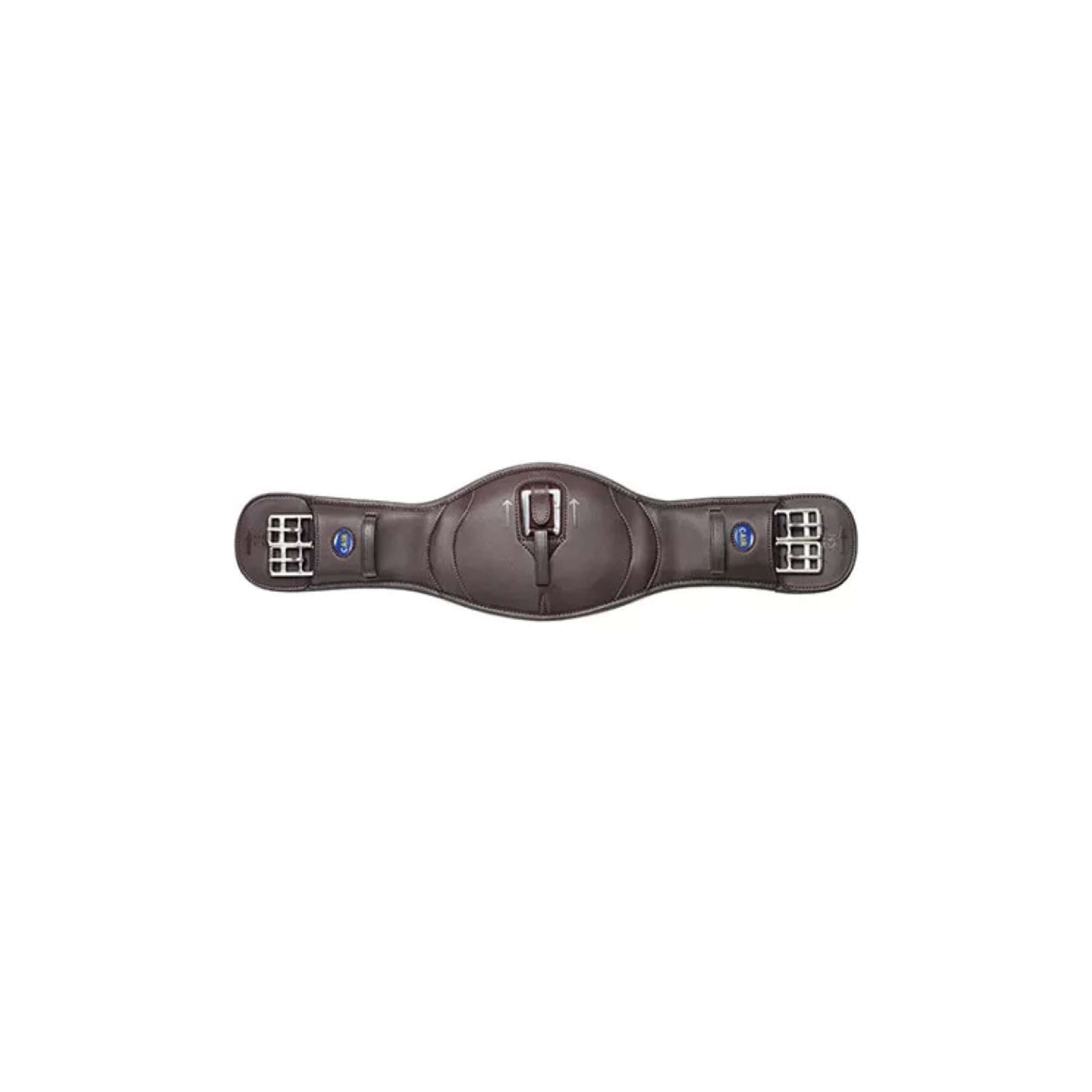 Corte anatómico, circunferencia sintética con estructura de panal. Acolchado con cojín CAIR en la zona central, que evita la presión sobre el esternón. Equipado con un anillo central de acero inoxidable sobre un refuerzo sintético y asegurado con una solapa sintética. Hebillas de rodillo de acero inoxidable sobre elástico en los extremos.